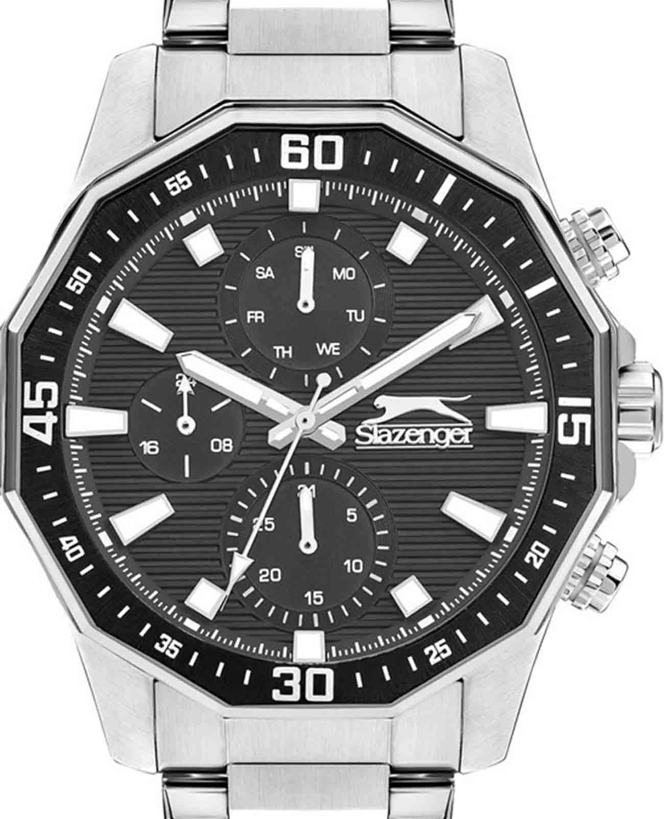 Стильные наручные часы Slazenger SL.09.2297.2.05 созданы для ценителей надежности и современного дизайна. Классический металлический корпус и серебристый браслет гармонично сочетают элегантность и практичность. Кварцевый механизм обеспечивает точность хода, а минеральное стеклоМинеральное стеклоМинеральное стекло представляет собой искусственно выращенный минерал кварца. Такое стекло отличается особой устойчивостью к повреждениям и царапинам. Уступает по некоторым качествам сапфировому стеклу. защищает циферблат от царапин. Особое внимание привлекает безельБезельВнешний ободок, закрепляющий стекло. В спортивных часах так называется поворотное кольцо с делениями на циферблате, выполняет роль таймера – замеряет отрезки времени на шкале. Неподвижный безель – элемент декора. Однонаправленно вращающийся безель на дайверских часах позволяет фиксировать моменты погружения и выныривания на поверхность. с черным IP-покрытиемIP-покрытиеМетод ионного напыления. Демонстрирует повышенную устойчивость к истиранию, окислению и химическим веществам. Под воздействием высокого давления и температуры около 1500°C молекулы металла надёжно соединяются с частицами корпуса часов.. На дополнительных малых циферблатах отображаются день недели, число и текущее время в 24-часовом формате. Модель оснащена люминесцентным покрытиемЛюминесцентное покрытиеПозволяет считывать показания времени в темноте. Производители наносят на стрелки, часовые индексы, безель или поверхность циферблата светонакопительный состав, дающий холодное свечение. стрелок и меток, что облегчает считывание времени в темноте. Водозащита 50 метров позволяет не снимать часы во время дождя или мытья рук. Заводная головка оснащена защитой, а задняя крышка завинчивается для дополнительной безопасности. Браслет снабжен удобной раскладной застёжкойРаскладная застёжкаТакой тип застёжки используется только на браслетах из металла. Она никогда не раскрывается полностью, происходит разделение на 2 и более частей. Раскладывающая застёжка снизит вероятность потери часов к минимуму.. Диаметр корпуса составляет 43 мм, толщина — 13 мм, ширина ремешка 22 мм, а вес часов — 167 грамм.