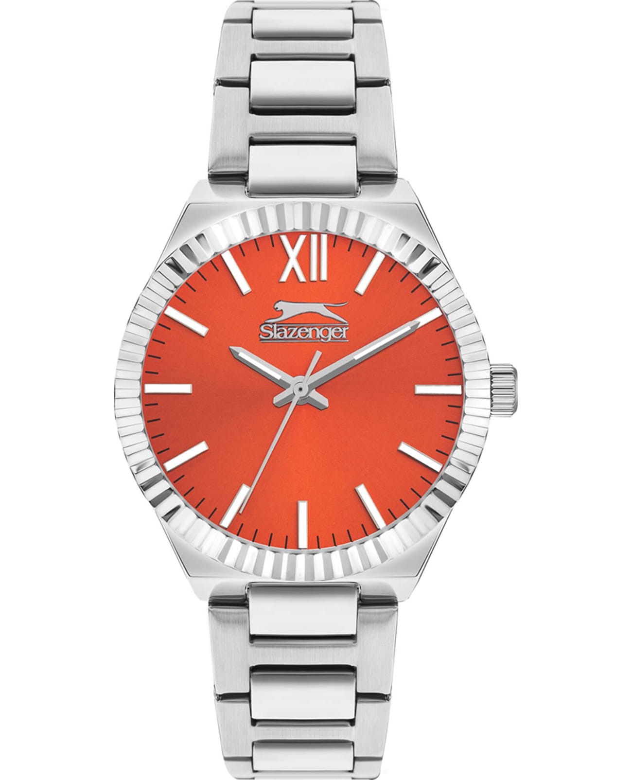 Женские кварцевые часы Slazenger SL.09.2304.3.01 — это элегантный и стильный аксессуар, идеально дополняющий любой образ. Корпус и браслет выполнены из суперметалла, защищён минеральным стекломМинеральное стеклоМинеральное стекло представляет собой искусственно выращенный минерал кварца. Такое стекло отличается особой устойчивостью к повреждениям и царапинам. Уступает по некоторым качествам сапфировому стеклу.. Циферблат оранжевого цвета оформлен в классическом стиле, стрелки оснащены люминесцентным покрытиемЛюминесцентное покрытиеПозволяет считывать показания времени в темноте. Производители наносят на стрелки, часовые индексы, безель или поверхность циферблата светонакопительный состав, дающий холодное свечение., обеспечивающим хорошую читаемость в темноте. Браслет из суперметалла фиксируется на раскладной застёжкеРаскладная застёжкаТакой тип застёжки используется только на браслетах из металла. Она никогда не раскрывается полностью, происходит разделение на 2 и более частей. Раскладывающая застёжка снизит вероятность потери часов к минимуму., обеспечивая надёжность и комфорт ношения. Водонепроницаемость 30 м позволяет использовать часы в повседневных условиях, защищая от случайных брызг и капель дождя. Модель сочетает в себе лёгкость, прочность и изысканный внешний вид.