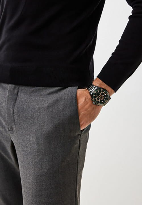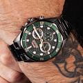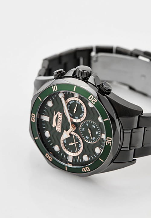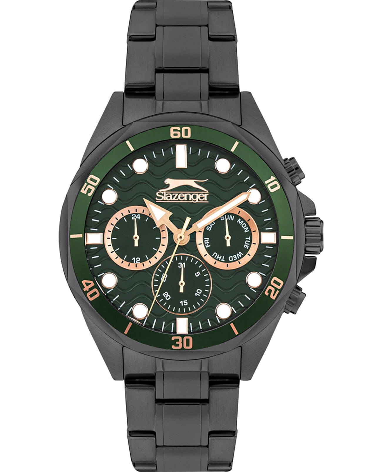 Мужские кварцевые часы Slazenger SL.09.2309.2.02 — это выразительный и функциональный аксессуар, сочетающий прочность, стиль и насыщенную комплектацию. Корпус и браслет выполнены из суперметалла с IP-покрытиемIP-покрытиеМетод ионного напыления. Демонстрирует повышенную устойчивость к истиранию, окислению и химическим веществам. Под воздействием высокого давления и температуры около 1500°C молекулы металла надёжно соединяются с частицами корпуса часов., защищён минеральным стекломМинеральное стеклоМинеральное стекло представляет собой искусственно выращенный минерал кварца. Такое стекло отличается особой устойчивостью к повреждениям и царапинам. Уступает по некоторым качествам сапфировому стеклу.. Циферблат зелёного цвета оформлен с вынесенными малыми циферблатами для индикации дня недели, даты и времени в 24-часовом формате. Стрелки и метки оснащены люминесцентным покрытиемЛюминесцентное покрытиеПозволяет считывать показания времени в темноте. Производители наносят на стрелки, часовые индексы, безель или поверхность циферблата светонакопительный состав, дающий холодное свечение., обеспечивающим хорошую читаемость в темноте. Заводная головка снабжена защитой, а задняя крышка — завинчивающаяся, что повышает надёжность конструкции. Браслет фиксируется на раскладной застёжкеРаскладная застёжкаТакой тип застёжки используется только на браслетах из металла. Она никогда не раскрывается полностью, происходит разделение на 2 и более частей. Раскладывающая застёжка снизит вероятность потери часов к минимуму., обеспечивая удобство и безопасность ношения. Водонепроницаемость 50 м позволяет использовать часы в повседневных условиях, защищая от случайных брызг и капель дождя. Модель подчёркивает индивидуальность владельца и идеально подходит как для повседневного, так и для делового образа.