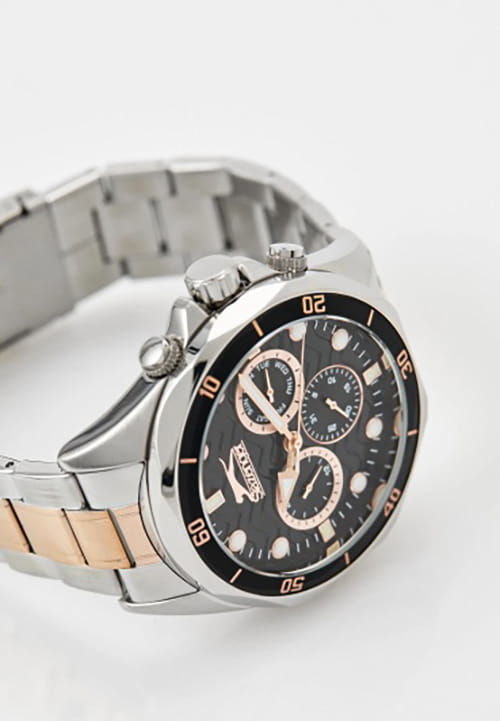 Мужские кварцевые часы Slazenger SL.09.2309.2.04 — это выразительный и функциональный аксессуар, сочетающий прочность, стиль и насыщенную комплектацию. Браслет выполнен из суперметалла с IP-покрытиемIP-покрытиеМетод ионного напыления. Демонстрирует повышенную устойчивость к истиранию, окислению и химическим веществам. Под воздействием высокого давления и температуры около 1500°C молекулы металла надёжно соединяются с частицами корпуса часов., защищён минеральным стекломМинеральное стеклоМинеральное стекло представляет собой искусственно выращенный минерал кварца. Такое стекло отличается особой устойчивостью к повреждениям и царапинам. Уступает по некоторым качествам сапфировому стеклу.. Циферблат чёрного цвета оформлен с вынесенными малыми циферблатами для индикации дня недели, даты и времени в 24-часовом формате. Стрелки и метки оснащены люминесцентным покрытиемЛюминесцентное покрытиеПозволяет считывать показания времени в темноте. Производители наносят на стрелки, часовые индексы, безель или поверхность циферблата светонакопительный состав, дающий холодное свечение., обеспечивающим хорошую читаемость в темноте. Заводная головка снабжена защитой, а задняя крышка — завинчивающаяся, что повышает надёжность конструкции. Браслет комбинированного цвета фиксируется на раскладной застёжкеРаскладная застёжкаТакой тип застёжки используется только на браслетах из металла. Она никогда не раскрывается полностью, происходит разделение на 2 и более частей. Раскладывающая застёжка снизит вероятность потери часов к минимуму., обеспечивая удобство и безопасность ношения. Водонепроницаемость 50 м позволяет использовать часы в повседневных условиях, защищая от случайных брызг и капель дождя. Модель подчёркивает индивидуальность владельца и идеально подходит как для повседневного, так и для делового образа.