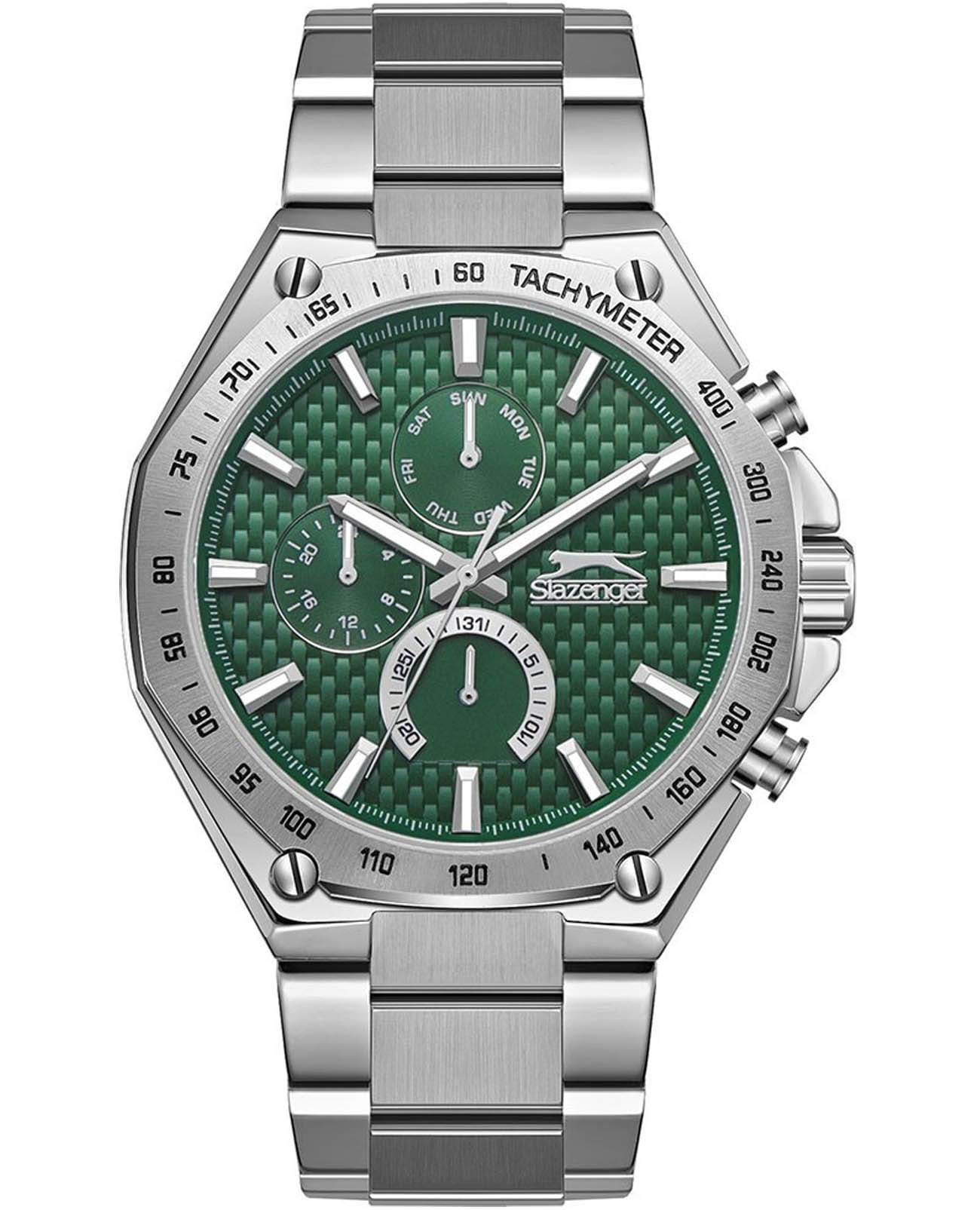 Мужские кварцевые часы Slazenger SL.09.2325.2.03 — это выразительный и функциональный аксессуар, сочетающий стиль, прочность и насыщенную комплектацию. Корпус и браслет выполнены из суперметалла, а циферблат оформлен в зеленых тонах. Циферблат защищён минеральным стекломМинеральное стеклоМинеральное стекло представляет собой искусственно выращенный минерал кварца. Такое стекло отличается особой устойчивостью к повреждениям и царапинам. Уступает по некоторым качествам сапфировому стеклу. и дополнен вынесенными малыми циферблатами для индикации дня недели, даты и времени в 24-часовом формате. БезельБезельВнешний ободок, закрепляющий стекло. В спортивных часах так называется поворотное кольцо с делениями на циферблате, выполняет роль таймера – замеряет отрезки времени на шкале. Неподвижный безель – элемент декора. Однонаправленно вращающийся безель на дайверских часах позволяет фиксировать моменты погружения и выныривания на поверхность. дополнен тахиметромТахиметрРазмеченная шкала, располагается на ободке или безеле часов. Тахиметр позволяет рассчитать скорость на определённом участке пути, расстояние измеряется в километрах или милях.. Стрелки и метки оснащены люминесцентным покрытиемЛюминесцентное покрытиеПозволяет считывать показания времени в темноте. Производители наносят на стрелки, часовые индексы, безель или поверхность циферблата светонакопительный состав, дающий холодное свечение., обеспечивающим хорошую читаемость в темноте. Браслет из суперметалла фиксируется на раскладной застёжкеРаскладная застёжкаТакой тип застёжки используется только на браслетах из металла. Она никогда не раскрывается полностью, происходит разделение на 2 и более частей. Раскладывающая застёжка снизит вероятность потери часов к минимуму., обеспечивая удобство и безопасность ношения. Водонепроницаемость 50 м позволяет использовать часы в повседневных условиях, защищая от случайных брызг и капель дождя. Модель подчёркивает индивидуальность владельца и идеально подходит как для повседневного, так и для делового образа.