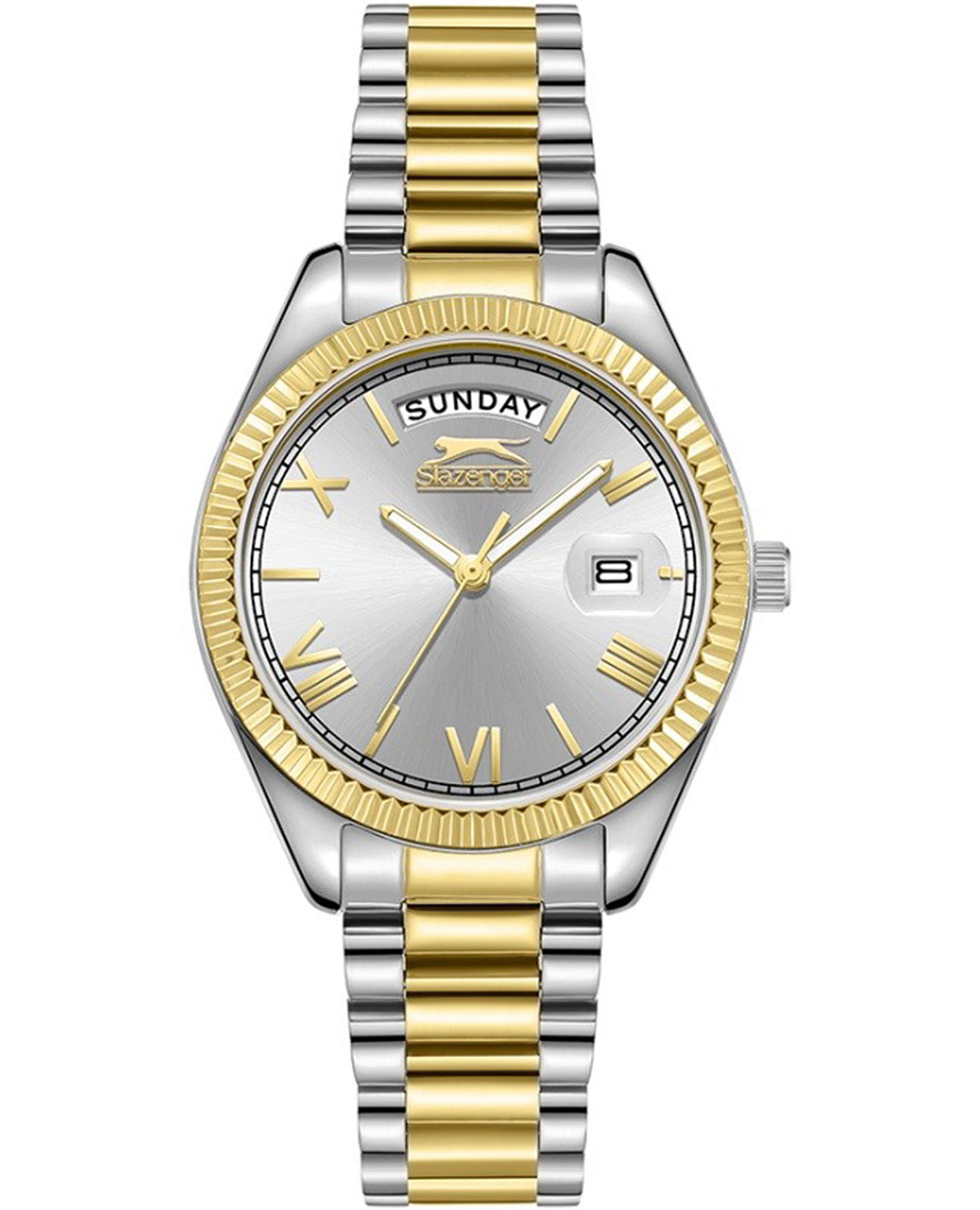 Женские элегантные наручные часы Slazenger SL.09.2338.4.04 сочетают в себе современный стиль и функциональность. Стильный корпус выполнен из суперметалла, а неповоротный безельБезельВнешний ободок, закрепляющий стекло. В спортивных часах так называется поворотное кольцо с делениями на циферблате, выполняет роль таймера – замеряет отрезки времени на шкале. Неподвижный безель – элемент декора. Однонаправленно вращающийся безель на дайверских часах позволяет фиксировать моменты погружения и выныривания на поверхность. с IP-покрытиемIP-покрытиеМетод ионного напыления. Демонстрирует повышенную устойчивость к истиранию, окислению и химическим веществам. Под воздействием высокого давления и температуры около 1500°C молекулы металла надёжно соединяются с частицами корпуса часов., придающий модели дополнительную прочность и элегантный внешний вид. Изысканный циферблат защищён минеральным стекломМинеральное стеклоМинеральное стекло представляет собой искусственно выращенный минерал кварца. Такое стекло отличается особой устойчивостью к повреждениям и царапинам. Уступает по некоторым качествам сапфировому стеклу., устойчивым к царапинам и повреждениям. Водонепроницаемость 3 АТМ позволяет использовать часы в повседневных условиях — при мытье рук или под лёгким дождём. Браслет из суперметалла с частичным IP-покрытиемIP-покрытиеМетод ионного напыления. Демонстрирует повышенную устойчивость к истиранию, окислению и химическим веществам. Под воздействием высокого давления и температуры около 1500°C молекулы металла надёжно соединяются с частицами корпуса часов. и с раскладной застёжкойРаскладная застёжкаТакой тип застёжки используется только на браслетах из металла. Она никогда не раскрывается полностью, происходит разделение на 2 и более частей. Раскладывающая застёжка снизит вероятность потери часов к минимуму., обеспечивающий надёжную фиксацию и комфорт при ношении. Окошко даты находится в положении 3 часа. Cтрелки покрыты люминесцентным покрытиемЛюминесцентное покрытиеПозволяет считывать показания времени в темноте. Производители наносят на стрелки, часовые индексы, безель или поверхность циферблата светонакопительный состав, дающий холодное свечение. для читаемости в условиях недостаточного освещения. Эта модель идеально подходит для женщин, ценящих стиль, функциональность и надёжность в одном аксессуаре.