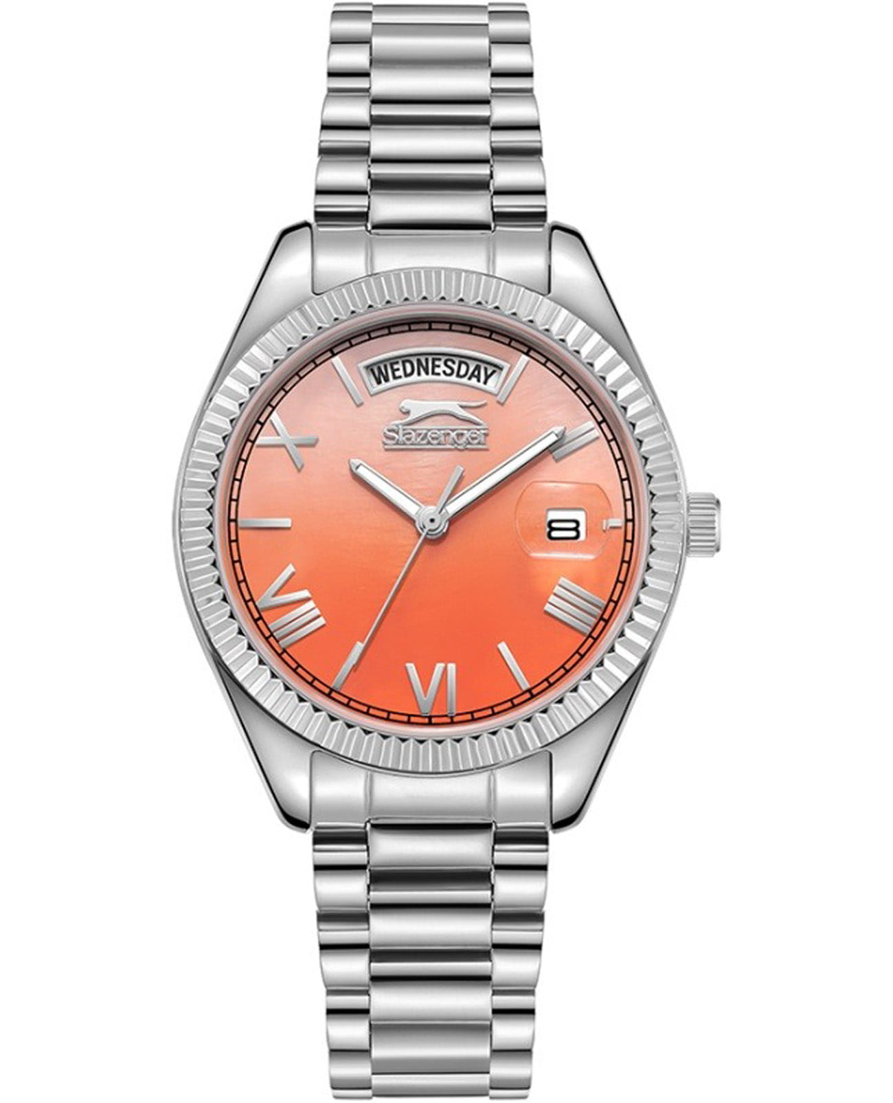 Женские элегантные наручные часы Slazenger SL.09.2338.4.06 сочетают в себе современный стиль и функциональность. Стильный корпус выполнен из суперметалла, придающий модели дополнительную прочность и элегантный внешний вид. Изысканный циферблат защищён минеральным стекломМинеральное стеклоМинеральное стекло представляет собой искусственно выращенный минерал кварца. Такое стекло отличается особой устойчивостью к повреждениям и царапинам. Уступает по некоторым качествам сапфировому стеклу., устойчивым к царапинам и повреждениям. Водонепроницаемость 3 АТМ позволяет использовать часы в повседневных условиях — при мытье рук или под лёгким дождём. Cтрелки покрыты люминесцентным покрытиемЛюминесцентное покрытиеПозволяет считывать показания времени в темноте. Производители наносят на стрелки, часовые индексы, безель или поверхность циферблата светонакопительный состав, дающий холодное свечение. для читаемости в условиях недостаточного освещения. Браслет из суперметалла и с раскладной застёжкойРаскладная застёжкаТакой тип застёжки используется только на браслетах из металла. Она никогда не раскрывается полностью, происходит разделение на 2 и более частей. Раскладывающая застёжка снизит вероятность потери часов к минимуму., обеспечивающий надёжную фиксацию и комфорт при ношении. Окошко даты находится в положении 3 часа. Эта модель идеально подходит для женщин, ценящих стиль, функциональность и надёжность в одном аксессуаре.