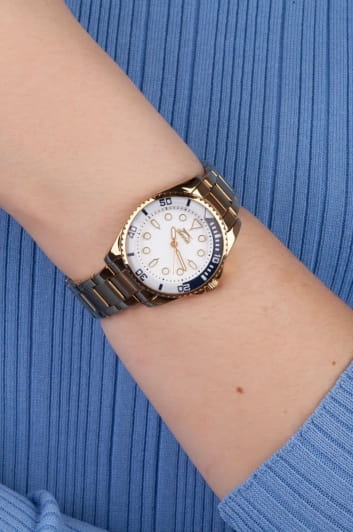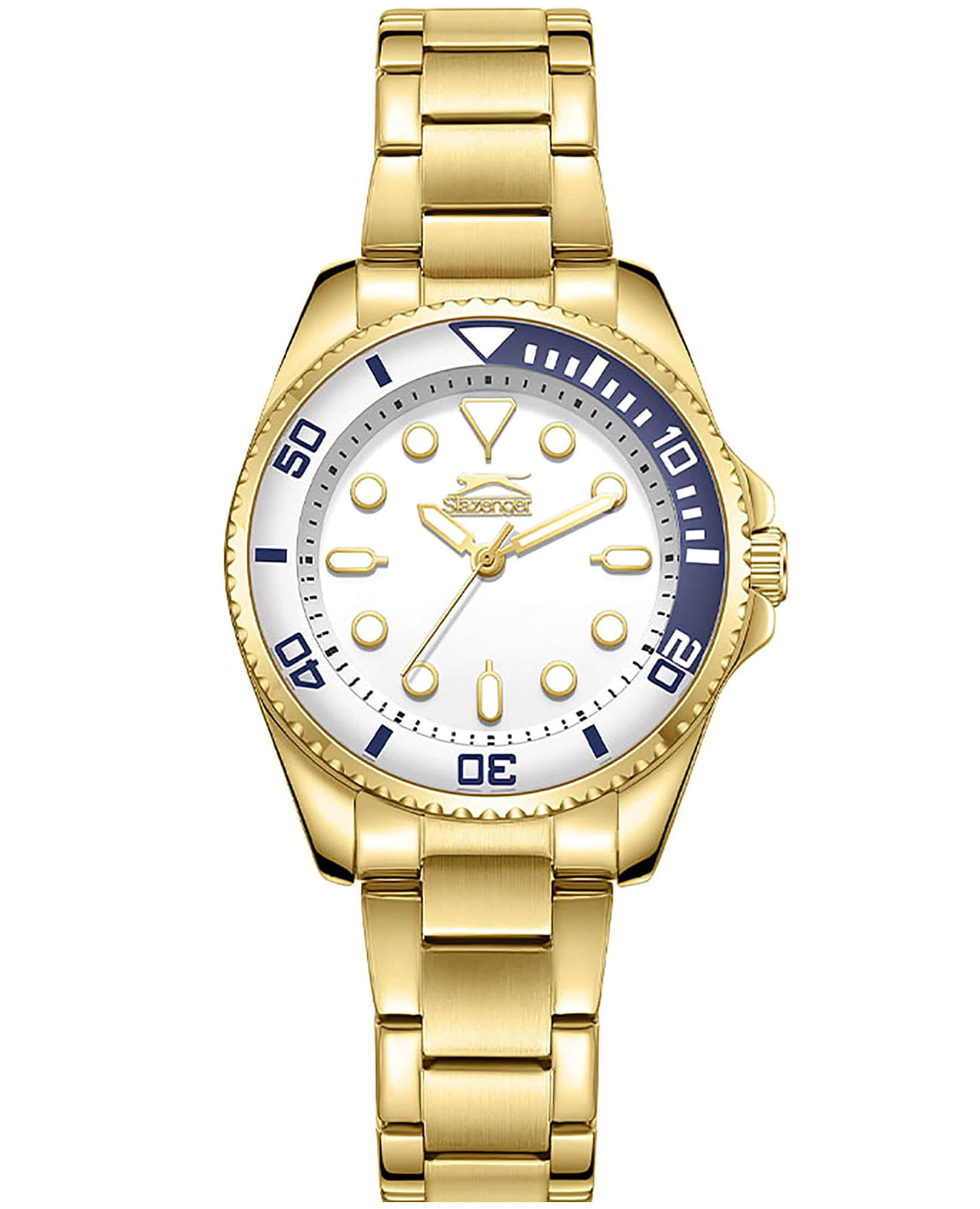 Женские кварцевые часы Slazenger SL.09.2353.3.02 – это сочетание элегантности, современного стиля и надёжности. Изящный корпус из суперметалла с IP-покрытиемIP-покрытиеМетод ионного напыления. Демонстрирует повышенную устойчивость к истиранию, окислению и химическим веществам. Под воздействием высокого давления и температуры около 1500°C молекулы металла надёжно соединяются с частицами корпуса часов. золотистого цвета, диаметром 32 мм и толщиной 10 мм, подчёркивает утончённость модели и делает их идеальным аксессуаром для любой ситуации – будь то деловая встреча, романтический вечер или повседневные выходы. Циферблат надёжно защищён минеральным стекломМинеральное стеклоМинеральное стекло представляет собой искусственно выращенный минерал кварца. Такое стекло отличается особой устойчивостью к повреждениям и царапинам. Уступает по некоторым качествам сапфировому стеклу., которое устойчиво к механическим повреждениям и сохраняет кристальную прозрачность. Браслет из суперметалла удобно облегает запястье и фиксируется с помощью раскладной застёжкиРаскладная застёжкаТакой тип застёжки используется только на браслетах из металла. Она никогда не раскрывается полностью, происходит разделение на 2 и более частей. Раскладывающая застёжка снизит вероятность потери часов к минимуму., обеспечивая надёжность и комфорт в повседневном ношении. Утончённый стиль, внимание к деталям и практичность делают эту модель идеальным выбором для современных женщин, ценящих эстетику и функциональность. Поворотный безельБезельВнешний ободок, закрепляющий стекло. В спортивных часах так называется поворотное кольцо с делениями на циферблате, выполняет роль таймера – замеряет отрезки времени на шкале. Неподвижный безель – элемент декора. Однонаправленно вращающийся безель на дайверских часах позволяет фиксировать моменты погружения и выныривания на поверхность. с IP-покрытиемIP-покрытиеМетод ионного напыления. Демонстрирует повышенную устойчивость к истиранию, окислению и химическим веществам. Под воздействием высокого давления и температуры около 1500°C молекулы металла надёжно соединяются с частицами корпуса часов.. Стрелки и метки покрыты люминесцентным покрытиемЛюминесцентное покрытиеПозволяет считывать показания времени в темноте. Производители наносят на стрелки, часовые индексы, безель или поверхность циферблата светонакопительный состав, дающий холодное свечение., обеспечивающим отличную читаемость в темноте. Водозащита до 30 метров позволит защитить корпус от случайных брызг или капель дождя.