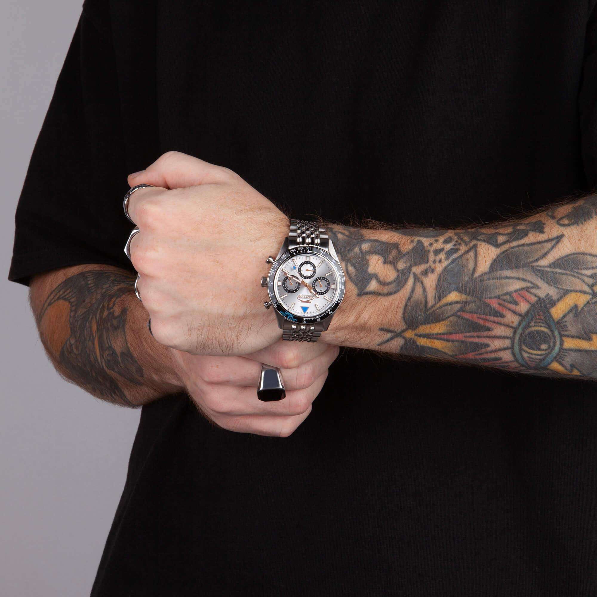 Мужские кварцевые часы Slazenger SL.09.2360.2.05 – идеальное сочетание классического дизайна и современных технологий, созданное для уверенных в себе мужчин. Корпус выполнен из суперметалла серебристого цвета, диаметром 43 мм и толщиной 12 мм, подчёркивает надежность модели и делает их идеальным аксессуаром для любой ситуации – будь то деловая встреча или повседневные выходы. Циферблат надёжно защищён минеральным стекломМинеральное стеклоМинеральное стекло представляет собой искусственно выращенный минерал кварца. Такое стекло отличается особой устойчивостью к повреждениям и царапинам. Уступает по некоторым качествам сапфировому стеклу., которое устойчиво к механическим повреждениям и сохраняет кристальную прозрачность. Неподвижный безельБезельВнешний ободок, закрепляющий стекло. В спортивных часах так называется поворотное кольцо с делениями на циферблате, выполняет роль таймера – замеряет отрезки времени на шкале. Неподвижный безель – элемент декора. Однонаправленно вращающийся безель на дайверских часах позволяет фиксировать моменты погружения и выныривания на поверхность. с IP-покрытиемIP-покрытиеМетод ионного напыления. Демонстрирует повышенную устойчивость к истиранию, окислению и химическим веществам. Под воздействием высокого давления и температуры около 1500°C молекулы металла надёжно соединяются с частицами корпуса часов. черного цвета. Стальной браслет на раскладной застёжкеРаскладная застёжкаТакой тип застёжки используется только на браслетах из металла. Она никогда не раскрывается полностью, происходит разделение на 2 и более частей. Раскладывающая застёжка снизит вероятность потери часов к минимуму. удобно облегает запястье, обеспечивая надёжность и комфорт в повседневном ношении. Стрелки и метки покрыты люминесцентным покрытиемЛюминесцентное покрытиеПозволяет считывать показания времени в темноте. Производители наносят на стрелки, часовые индексы, безель или поверхность циферблата светонакопительный состав, дающий холодное свечение., обеспечивающим отличную читаемость в темноте. Эти часы станут не просто аксессуаром, а надежным спутником в любой ситуации, подчеркивая ваш безупречный вкус и деловой стиль. Вынесенный циферблат с 24-х часовым указателем времени и функция тахиметраТахиметрРазмеченная шкала, располагается на ободке или безеле часов. Тахиметр позволяет рассчитать скорость на определённом участке пути, расстояние измеряется в километрах или милях.. Водозащита 50 метров позволит защитить корпус от случайных брызг или капель дождя.