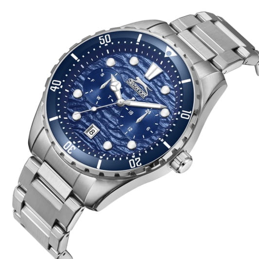 Мужские кварцевые часы Slazenger SL.09.2366.2.01 – идеальное сочетание классического дизайна и современных технологий, созданное для уверенных в себе мужчин. Корпус выполнен из нержавеющей стали серебристого цвета, диаметром 44 мм и толщиной 12 мм, подчёркивает надежность модели и делает их идеальным аксессуаром для любой ситуации – будь то деловая встреча или повседневные выходы. Циферблат надёжно защищён минеральным стекломМинеральное стеклоМинеральное стекло представляет собой искусственно выращенный минерал кварца. Такое стекло отличается особой устойчивостью к повреждениям и царапинам. Уступает по некоторым качествам сапфировому стеклу., которое устойчиво к механическим повреждениям и сохраняет кристальную прозрачность. Поворотный безельБезельВнешний ободок, закрепляющий стекло. В спортивных часах так называется поворотное кольцо с делениями на циферблате, выполняет роль таймера – замеряет отрезки времени на шкале. Неподвижный безель – элемент декора. Однонаправленно вращающийся безель на дайверских часах позволяет фиксировать моменты погружения и выныривания на поверхность. с IP-покрытиемIP-покрытиеМетод ионного напыления. Демонстрирует повышенную устойчивость к истиранию, окислению и химическим веществам. Под воздействием высокого давления и температуры около 1500°C молекулы металла надёжно соединяются с частицами корпуса часов.. Стальной браслет удобно облегает запястье и фиксируется с помощью раскладной застёжкиРаскладная застёжкаТакой тип застёжки используется только на браслетах из металла. Она никогда не раскрывается полностью, происходит разделение на 2 и более частей. Раскладывающая застёжка снизит вероятность потери часов к минимуму., обеспечивая надёжность и комфорт в повседневном ношении. Стрелки и метки покрыты люминесцентным покрытиемЛюминесцентное покрытиеПозволяет считывать показания времени в темноте. Производители наносят на стрелки, часовые индексы, безель или поверхность циферблата светонакопительный состав, дающий холодное свечение., обеспечивающим отличную читаемость в темноте. Эти часы станут не просто аксессуаром, а надежным спутником в любой ситуации, подчеркивая ваш безупречный вкус и деловой стиль. Окошко даты находится в положении 6 часов. Вынесенный циферблат с 24-х часовым указателем времени. Водозащита до 100 метров позволит плавать, нырять и заниматься другими водными видами спорта. Функция второго часового поясаВторой часовой поясФункция, позволяющая отображать время двух часовых поясов одновременно..