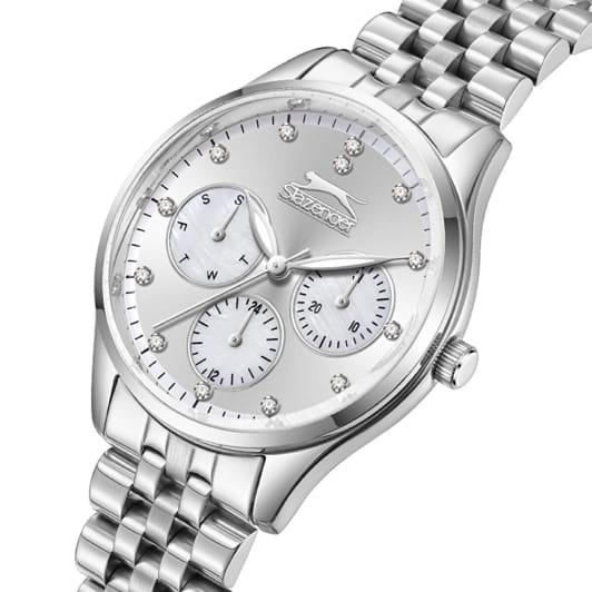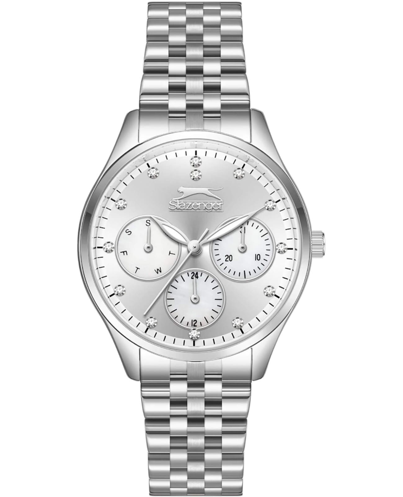 Женские кварцевые часы Slazenger — это элегантный и функциональный аксессуар. Корпус диаметром 34 мм и толщиной 11 мм выполнен из суперметалла. Циферблат серебристого цвета оформлен индексами и стрелками, украшен фианитами. Циферблат защищён минеральным стекломМинеральное стеклоМинеральное стекло представляет собой искусственно выращенный минерал кварца. Такое стекло отличается особой устойчивостью к повреждениям и царапинам. Уступает по некоторым качествам сапфировому стеклу.. Механизм — кварцевый. Часы оснащены индикацией дня недели, даты и 12/24-часового формата времени. Часы оснащены браслетом из суперметалла с раскладной застёжкойРаскладная застёжкаТакой тип застёжки используется только на браслетах из металла. Она никогда не раскрывается полностью, происходит разделение на 2 и более частей. Раскладывающая застёжка снизит вероятность потери часов к минимуму.. Водонепроницаемость 50 м позволяет использовать часы в повседневных условиях. Гарантия — 12 месяцев. Идеальный выбор для тех, кто ценит стиль, функциональность и качество.
