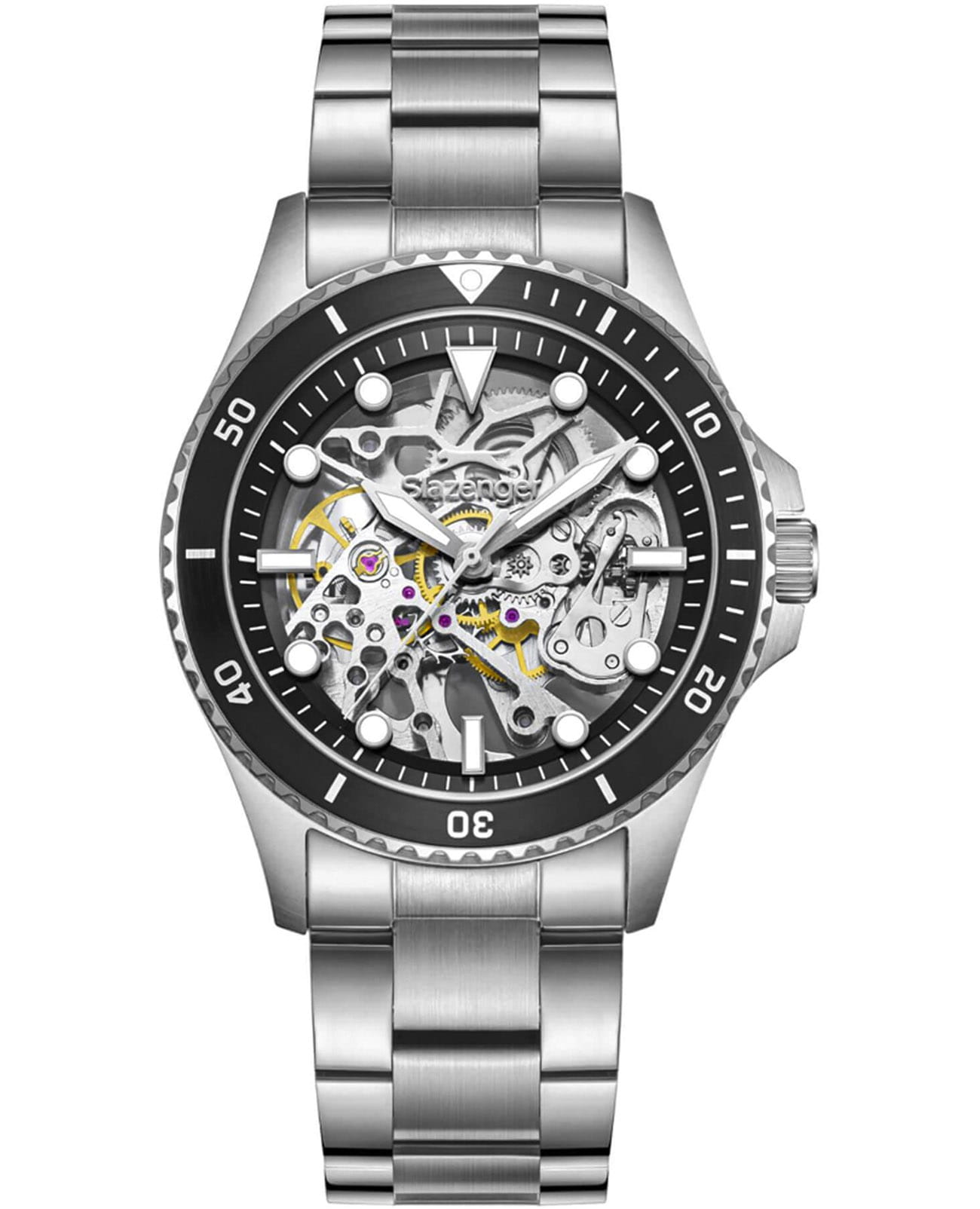 Мужские механические часы с автоподзаводом Slazenger — это выразительный и функциональный аксессуар. Корпус диаметром 42 мм и толщиной 15 мм выполнен из нержавеющей стали 316L. БезельБезельВнешний ободок, закрепляющий стекло. В спортивных часах так называется поворотное кольцо с делениями на циферблате, выполняет роль таймера – замеряет отрезки времени на шкале. Неподвижный безель – элемент декора. Однонаправленно вращающийся безель на дайверских часах позволяет фиксировать моменты погружения и выныривания на поверхность. — однонаправленный вращающийся. Циферблат чёрного цвета частично скелетонизирован, что позволяет наблюдать за работой механизма. Циферблат защищён минеральным стекломМинеральное стеклоМинеральное стекло представляет собой искусственно выращенный минерал кварца. Такое стекло отличается особой устойчивостью к повреждениям и царапинам. Уступает по некоторым качествам сапфировому стеклу.. Механизм — автоматический калибр. Прозрачная задняя крышка открывает вид на декорированный механизм. Стрелки и метки с люминесцентным покрытиемЛюминесцентное покрытиеПозволяет считывать показания времени в темноте. Производители наносят на стрелки, часовые индексы, безель или поверхность циферблата светонакопительный состав, дающий холодное свечение., обеспечивающим хорошую читаемость в темноте. Часы оснащены стальным браслетом с раскладной застёжкойРаскладная застёжкаТакой тип застёжки используется только на браслетах из металла. Она никогда не раскрывается полностью, происходит разделение на 2 и более частей. Раскладывающая застёжка снизит вероятность потери часов к минимуму.. Водонепроницаемость 100 м позволяет использовать часы для плавания и повседневного ношения. Гарантия — 12 месяцев. Идеальный выбор для тех, кто ценит стиль, технологичность и качество.