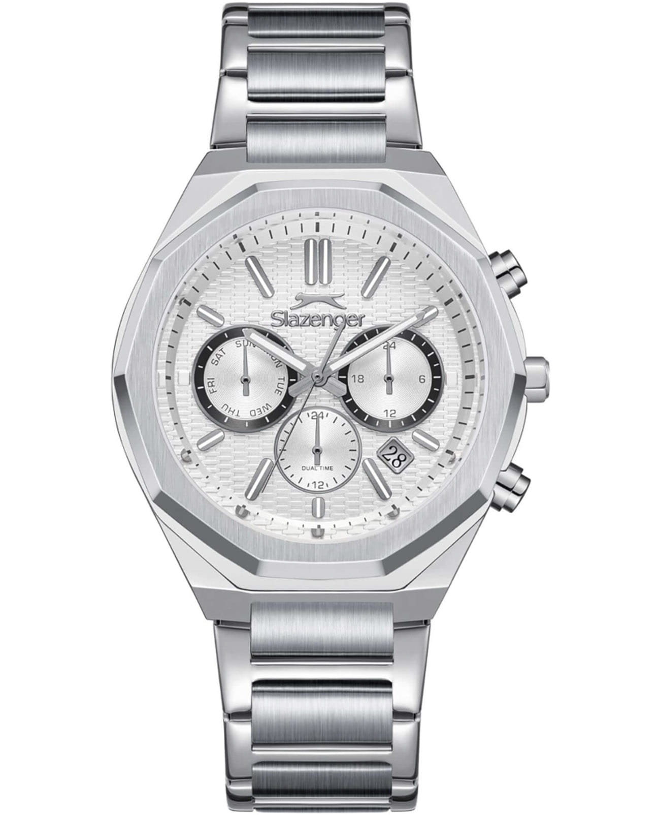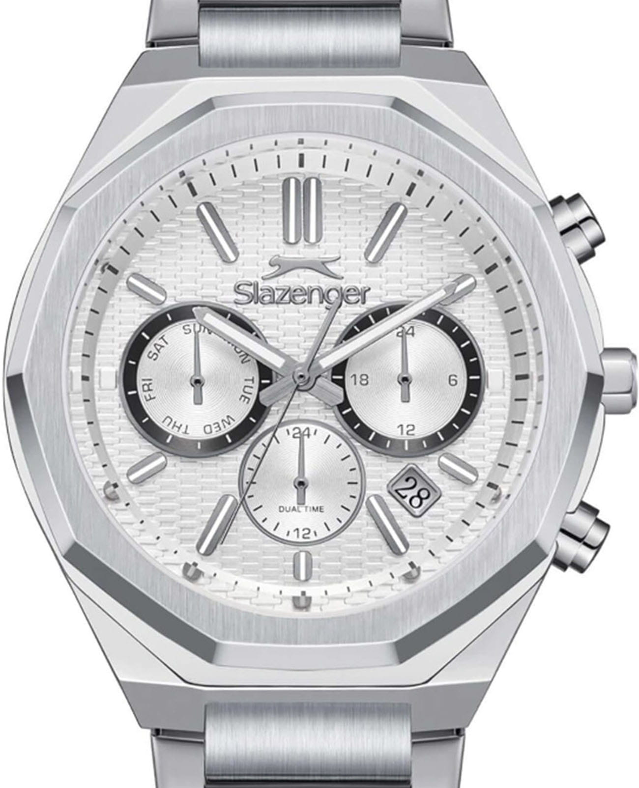 Мужские кварцевые часы Slazenger — это выразительный и функциональный аксессуар. Корпус диаметром 42 мм и толщиной 12,5 мм выполнен из нержавеющей стали 316L. Циферблат белого цвета оформлен индексами и стрелками. Окошко даты расположено между 4 и 5 часами. Указатель дня недели и 24-часовой формат времени вынесены на отдельные субциферблаты. Циферблат защищён минеральным стекломМинеральное стеклоМинеральное стекло представляет собой искусственно выращенный минерал кварца. Такое стекло отличается особой устойчивостью к повреждениям и царапинам. Уступает по некоторым качествам сапфировому стеклу.. Механизм — кварцевый калибр JP25. Часы оснащены функцией второго часового пояса (GMT)Второй часовой поясФункция, позволяющая отображать время двух часовых поясов одновременно.. Стрелки и метки с люминесцентным покрытиемЛюминесцентное покрытиеПозволяет считывать показания времени в темноте. Производители наносят на стрелки, часовые индексы, безель или поверхность циферблата светонакопительный состав, дающий холодное свечение., обеспечивающим хорошую читаемость в темноте. Часы оснащены стальным браслетом с раскладной застёжкойРаскладная застёжкаТакой тип застёжки используется только на браслетах из металла. Она никогда не раскрывается полностью, происходит разделение на 2 и более частей. Раскладывающая застёжка снизит вероятность потери часов к минимуму.. Водонепроницаемость 100 м позволяет использовать часы для плавания и повседневного ношения. Гарантия — 12 месяцев. Идеальный выбор для тех, кто ценит стиль, функциональность и качество.