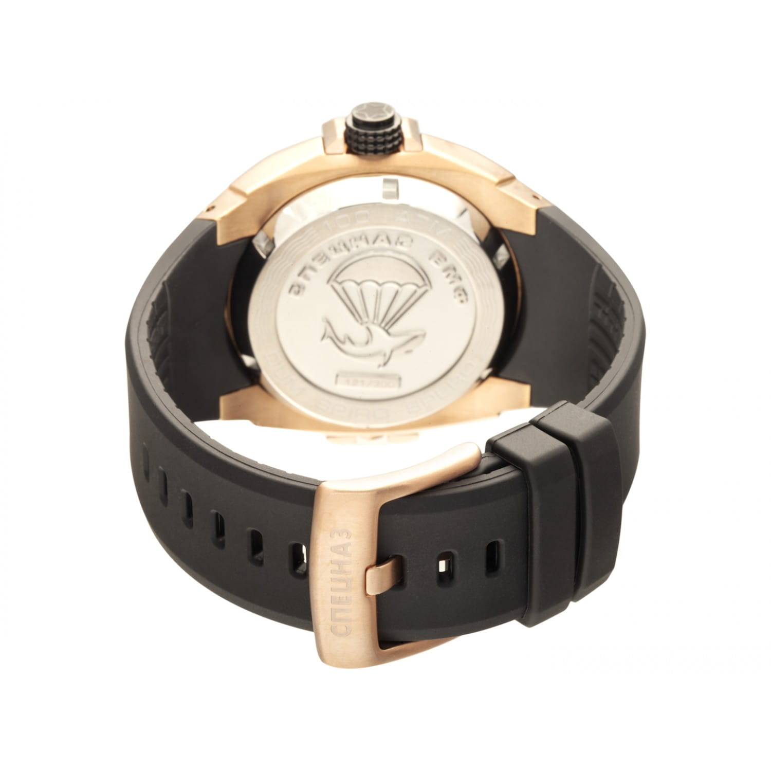 Часы Спецназ "Боевые Пловцы" С9473438-8215 — коллекционная модель, посвящённая элите военно-морского спецназа. Корпус диаметром 47 мм выполнен из нержавеющей стали PVD-покрытиемPVDУльтратонкое покрытие наносится в технике вакуумного напыления, сочетает в себе нитрид титана особой прочности со слоем золота или оксида хрома. Несёт в себе декоративную или защитную функцию. золотистого цвета, а синий циферблат защищён минеральным стекломМинеральное стеклоМинеральное стекло представляет собой искусственно выращенный минерал кварца. Такое стекло отличается особой устойчивостью к повреждениям и царапинам. Уступает по некоторым качествам сапфировому стеклу. с сапфировым покрытием.