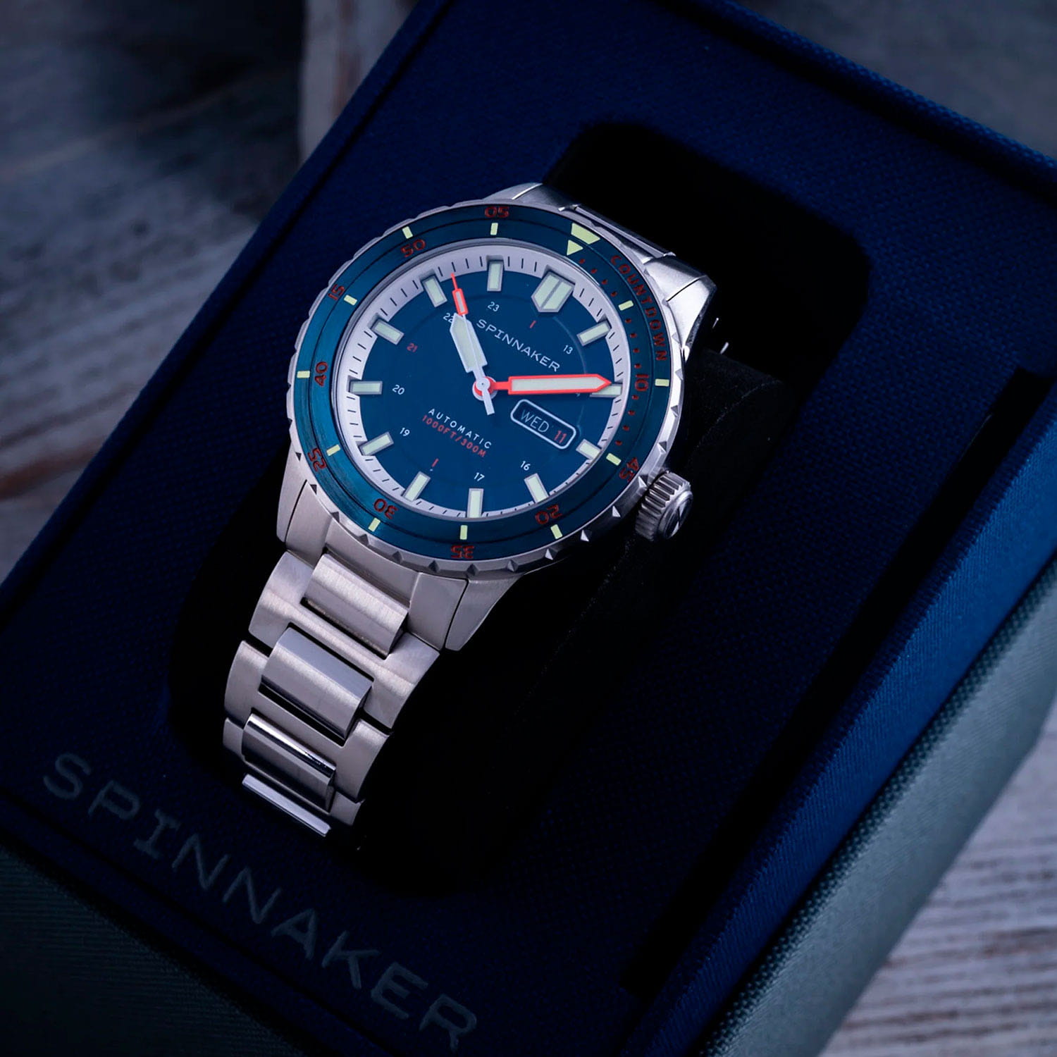 Мужские итальянские часы Spinnaker Hass SP-5099-44 с надёжным автоматическим механизмом. Сапфировое стеклоСапфировое стеклоПрочный и надёжный материал из кристалла сапфира синтетического происхождения, характеризующийся особой твёрдостью и устойчивостью к царапинам и повреждениям. с антибликовым покрытиемАнтибликовое покрытиеСлой оксида металла в 0,13-0,3 микрон, благодаря которому стекло часов не бликует и не отражает свет. Антибликовое покрытие уменьшает отражение света в 10 раз, обеспечивая отличную читаемость показателей циферблата., устойчивое к появлению царапин и обладающее высокой прозрачностью. Класс водозащиты: 300 метров, позволит плавать, нырять и заниматься другими водными видами спорта. Корпус часов изготовлен из нержавеющей стали с поворотным безелемБезельВнешний ободок, закрепляющий стекло. В спортивных часах так называется поворотное кольцо с делениями на циферблате, выполняет роль таймера – замеряет отрезки времени на шкале. Неподвижный безель – элемент декора. Однонаправленно вращающийся безель на дайверских часах позволяет фиксировать моменты погружения и выныривания на поверхность. с IP-покрытиемIP-покрытиеМетод ионного напыления. Демонстрирует повышенную устойчивость к истиранию, окислению и химическим веществам. Под воздействием высокого давления и температуры около 1500°C молекулы металла надёжно соединяются с частицами корпуса часов.. Браслет выполнен из нержавеющей стали на раскладной застёжкеРаскладная застёжкаТакой тип застёжки используется только на браслетах из металла. Она никогда не раскрывается полностью, происходит разделение на 2 и более частей. Раскладывающая застёжка снизит вероятность потери часов к минимуму.. Стрелки и метки с люминесцентным покрытиемЛюминесцентное покрытиеПозволяет считывать показания времени в темноте. Производители наносят на стрелки, часовые индексы, безель или поверхность циферблата светонакопительный состав, дающий холодное свечение.. Окошко дня недели и даты находится в положении 3 часа.