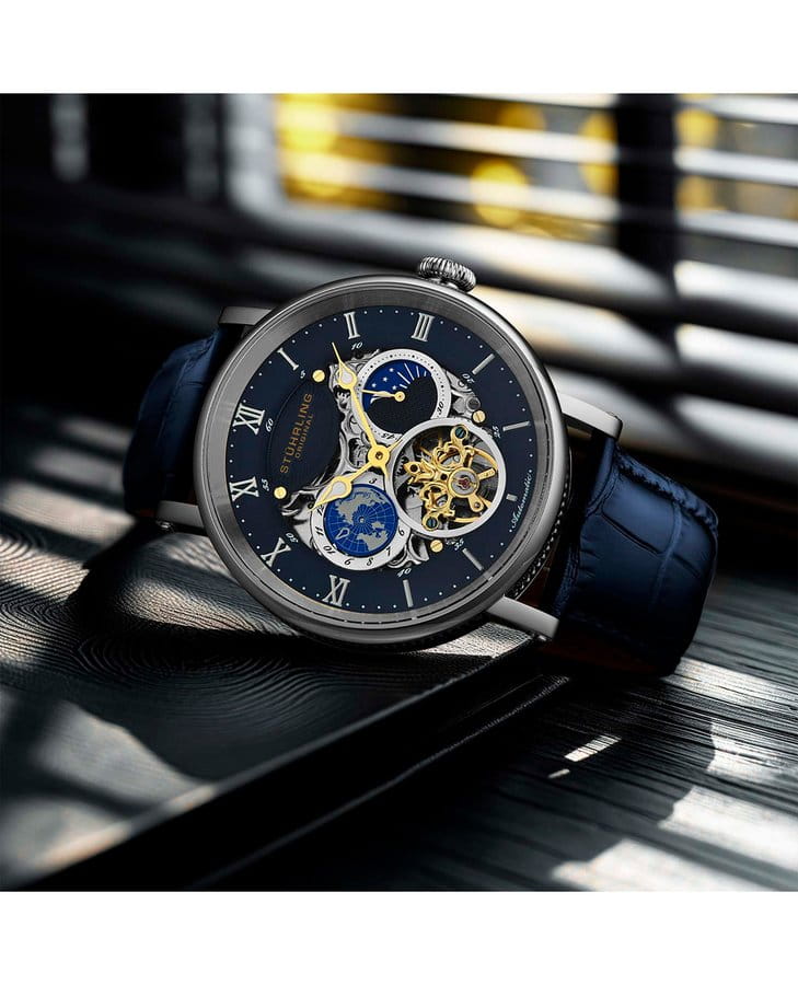 Мужские наручные часы Stuhrling Original 1015.02 представляют собой уникальное сочетание классической эстетики и современного часового мастерства . Модель оснащена механическим механизмом, работающим на автоподзаводе, что исключает необходимость ручного завода и обеспечивает высокую точность хода . Корпус часов диаметром 47 мм изготовлен из нержавеющей стали, а его защиту обеспечивает особо прочное стекло KrysternaKrysternaKrysterna — инновационное стекло для наручных часов. Благодаря уникальной структуре, Krysterna объединяет ключевые преимущества двух материалов: твердость сапфира, защищающую от царапин, и гибкость минерального стекла, обеспечивающую устойчивость к деформациям. Такая комбинация делает его идеальным решением для часов, подверженных экстремальным нагрузкам, сохраняя при этом оптическую прозрачность., известное своей устойчивостью к царапинам и механическим повреждениям . Циферблат выполнен в стиле , что позволяет наблюдать за работой внутреннего механизма и подчеркивает сложность инженерного решения . Этот дизайн делает модель не только функциональной, но и стильной, привлекая внимание ценителей сложных технических решений. Часы обладают водонепроницаемостью до 50 метров (5 атмосфер), что позволяет использовать их в повседневных условиях, включая контакт с водой, например, при мытье рук или дожде . Заводная головка с системой завинчивания обеспечивает дополнительную защиту механизма от внешних воздействий. Водонепроницаемость и надежный механизм делают эту модель идеальным выбором для тех, кто ценит как элегантность, так и практичность в повседневной жизни .