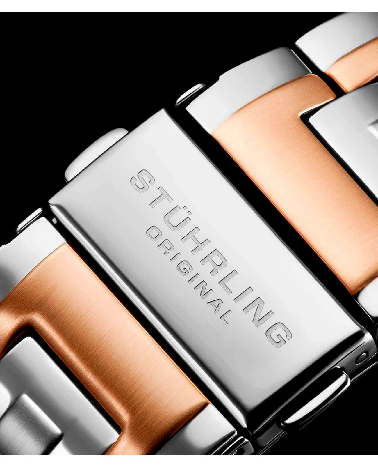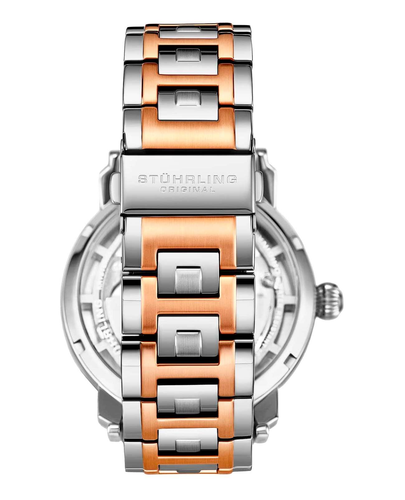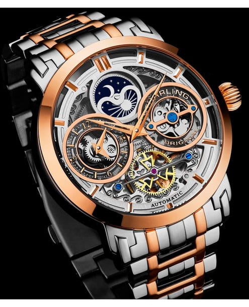 Мужские наручные часы Stührling Original 371B.05 из коллекции Luciano Automatic Skeleton сочетают в себе классический дизайн и современные технологии . Модель оснащена механическим механизмом с автоподзаводом, что гарантирует точность хода без необходимости ручного завода . Корпус часов диаметром 46 мм изготовлен из нержавеющей стали, что подчеркивает элегантность модели . БезельБезельВнешний ободок, закрепляющий стекло. В спортивных часах так называется поворотное кольцо с делениями на циферблате, выполняет роль таймера – замеряет отрезки времени на шкале. Неподвижный безель – элемент декора. Однонаправленно вращающийся безель на дайверских часах позволяет фиксировать моменты погружения и выныривания на поверхность. с PVD-покрытиемPVDУльтратонкое покрытие наносится в технике вакуумного напыления, сочетает в себе нитрид титана особой прочности со слоем золота или оксида хрома. Несёт в себе декоративную или защитную функцию.. Защиту циферблата обеспечивает прочное стекло KrysternaKrysternaKrysterna — инновационное стекло для наручных часов. Благодаря уникальной структуре, Krysterna объединяет ключевые преимущества двух материалов: твердость сапфира, защищающую от царапин, и гибкость минерального стекла, обеспечивающую устойчивость к деформациям. Такая комбинация делает его идеальным решением для часов, подверженных экстремальным нагрузкам, сохраняя при этом оптическую прозрачность., известное своей устойчивостью к царапинам и механическим повреждениям . Циферблат выполнен в стиле , что позволяет наблюдать за работой внутреннего механизма и демонстрирует сложность инженерного решения . Такой дизайн делает модель не только функциональной, но и стильной, привлекая внимание ценителей сложных технических решений. Часы оснащены функцией второго часового поясаВторой часовой поясФункция, позволяющая отображать время двух часовых поясов одновременно. и анимированным индикатором AM/PM в виде солнца и луны, что делает их удобными для путешественников . Водонепроницаемость модели достигает 5 атмосфер (50 метров), что позволяет использовать их в повседневных условиях, включая контакт с водой, например, при мытье рук или дожде . Заводная головка с системой завинчивания обеспечивает дополнительную защиту механизма от внешних воздействий.