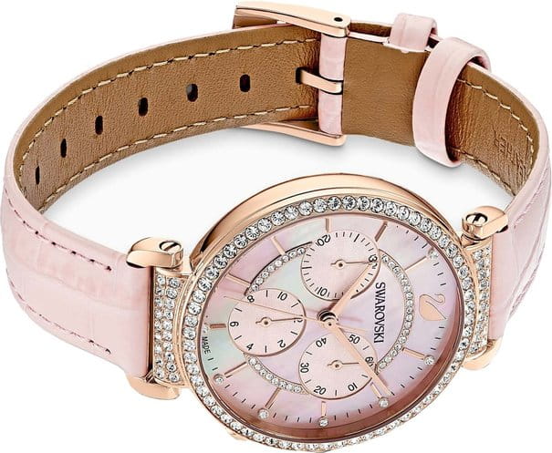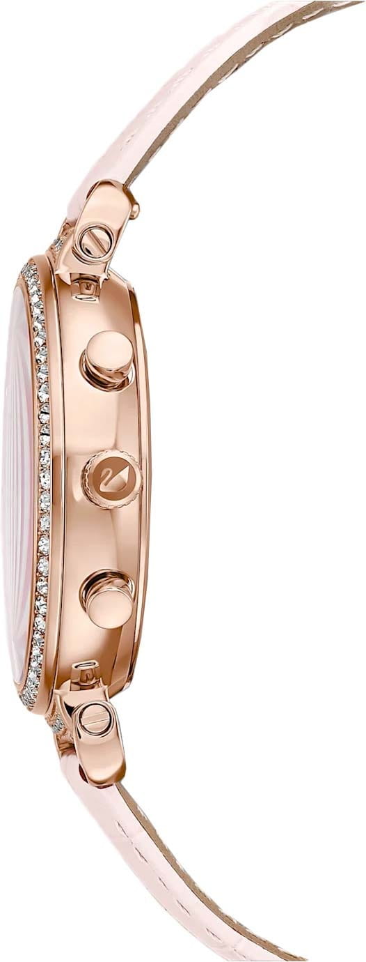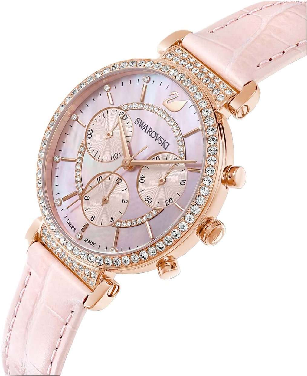 Изысканные швейцарские часы-хронографХронографФункция позволяет измерять отрезки времени с особой точностью: часы, минуты, секунды. Верным признаком хронографа является наличие на циферблате 3 дополнительных окошек-счётчиков. с секундомеромСекундомерСекундоме́р — прибор, способный измерять интервалы времени с точностью до долей секунды. Swarovski 5580352 подчеркнут вашу женственность и элегантность. Эти часы обладают кварцевым механизмом, обеспечивающим точность хода. Корпус выполнен из стали с розово-золотистым PVDPVDУльтратонкое покрытие наносится в технике вакуумного напыления, сочетает в себе нитрид титана особой прочности со слоем золота или оксида хрома. Несёт в себе декоративную или защитную функцию. покрытием, что придает им утонченный вид, а перламутровый розовый циферблат создает легкий и нежный акцент. Особое внимание привлекают кристаллы Swarovski, которые украшают как и безельБезельВнешний ободок, закрепляющий стекло. В спортивных часах так называется поворотное кольцо с делениями на циферблате, выполняет роль таймера – замеряет отрезки времени на шкале. Неподвижный безель – элемент декора. Однонаправленно вращающийся безель на дайверских часах позволяет фиксировать моменты погружения и выныривания на поверхность. с розово-золотистым PVDPVDУльтратонкое покрытие наносится в технике вакуумного напыления, сочетает в себе нитрид титана особой прочности со слоем золота или оксида хрома. Несёт в себе декоративную или защитную функцию. покрытием, так и циферблат, добавляя блеска и лоска. Кожаный ремешок с классической застежкой обеспечивает комфортное ношение и легкость замены, что позволяет легко адаптировать часы к вашему настроению и стилю. Эти часы с водозащитой 50WR подойдут для повседневного использования, а минеральное стеклоМинеральное стеклоМинеральное стекло представляет собой искусственно выращенный минерал кварца. Такое стекло отличается особой устойчивостью к повреждениям и царапинам. Уступает по некоторым качествам сапфировому стеклу. защитит их от царапин. Диаметр корпуса составляет 36 мм, а длина ремешка – 190 мм, что делает их удобными и подходящими для любой женской руки. Эти часы не просто аксессуар, а настоящее произведение искусства, способное стать ярким акцентом любого образа.