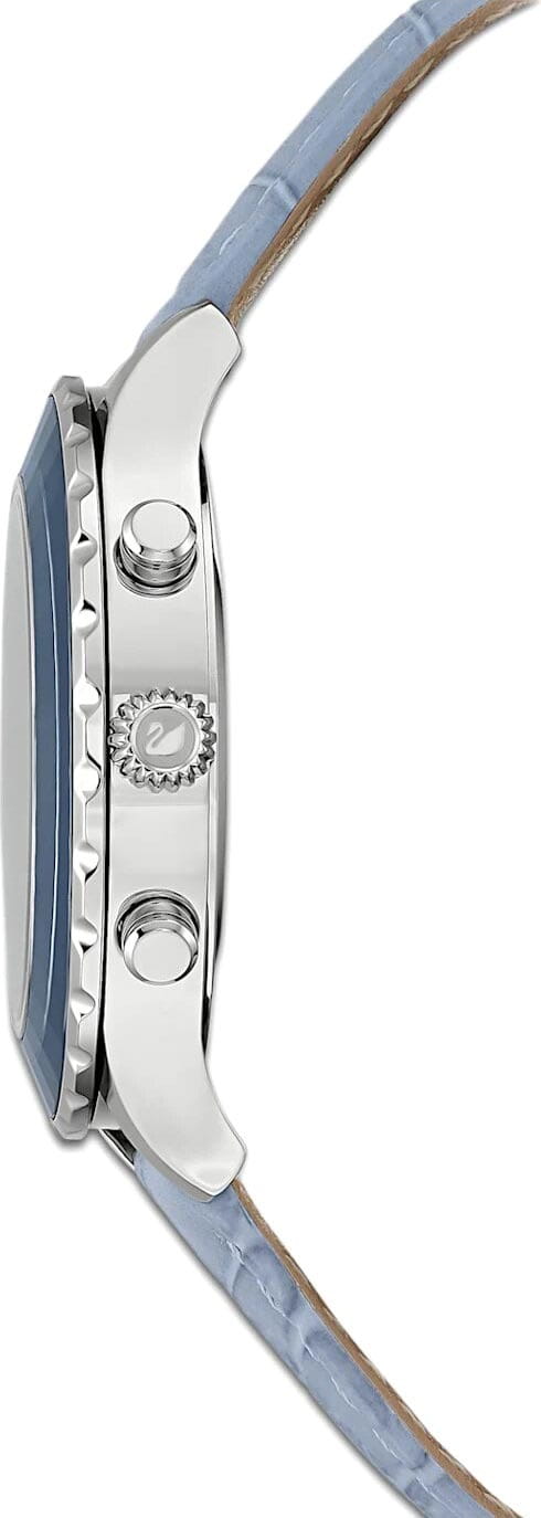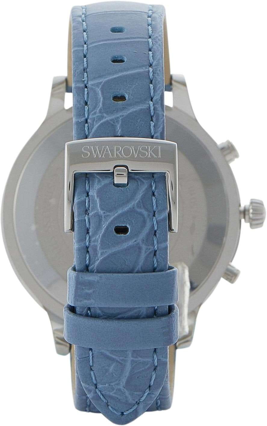 Часы Swarovski 5580600 – это роскошные женские часы с секундомеромСекундомерСекундоме́р — прибор, способный измерять интервалы времени с точностью до долей секунды. и хронографомХронографФункция позволяет измерять отрезки времени с особой точностью: часы, минуты, секунды. Верным признаком хронографа является наличие на циферблате 3 дополнительных окошек-счётчиков., поистине, образец точности и роскоши, ведь они сочетают в себе лучшие традиции швейцарского часового искусства и неповторимое мастерство Swarovski. Прекрасный аксессуар, подходящий к любому повседневному образу. Часы имеют функцию хронографаХронографФункция позволяет измерять отрезки времени с особой точностью: часы, минуты, секунды. Верным признаком хронографа является наличие на циферблате 3 дополнительных окошек-счётчиков., позволяющую запустить отсчет, остановить его и обнулить результаты. Корпус из нержавеющей стали покрытием серебристого оттенка гармонично сочетается с огранённым кристальным безелемБезельВнешний ободок, закрепляющий стекло. В спортивных часах так называется поворотное кольцо с делениями на циферблате, выполняет роль таймера – замеряет отрезки времени на шкале. Неподвижный безель – элемент декора. Однонаправленно вращающийся безель на дайверских часах позволяет фиксировать моменты погружения и выныривания на поверхность., который встречается только в коллекции часов Swarovski. Его голубое сияние удачно сочетается с синим циферблатом с рисунком в виде солнечных лучей и ремешком из натуральной кожи с тиснением под крокодила. Надежное минеральное стеклоМинеральное стеклоМинеральное стекло представляет собой искусственно выращенный минерал кварца. Такое стекло отличается особой устойчивостью к повреждениям и царапинам. Уступает по некоторым качествам сапфировому стеклу. защищает часы от царапин и долго сохраняет первоначальный внешний вид. На часовую, минутную стрелки нанесено люминесцентное покрытиеЛюминесцентное покрытиеПозволяет считывать показания времени в темноте. Производители наносят на стрелки, часовые индексы, безель или поверхность циферблата светонакопительный состав, дающий холодное свечение., которое светится в темноте, создавая необычное изображение. Эти часы станут не просто аксессуаром, а настоящим украшением, подчеркивающим индивидуальность и утонченность своей владелицы. Часы обладают водозащитой уровня WR 50, что позволяет им выдерживать воздействие воды в повседневных ситуациях.