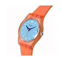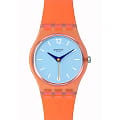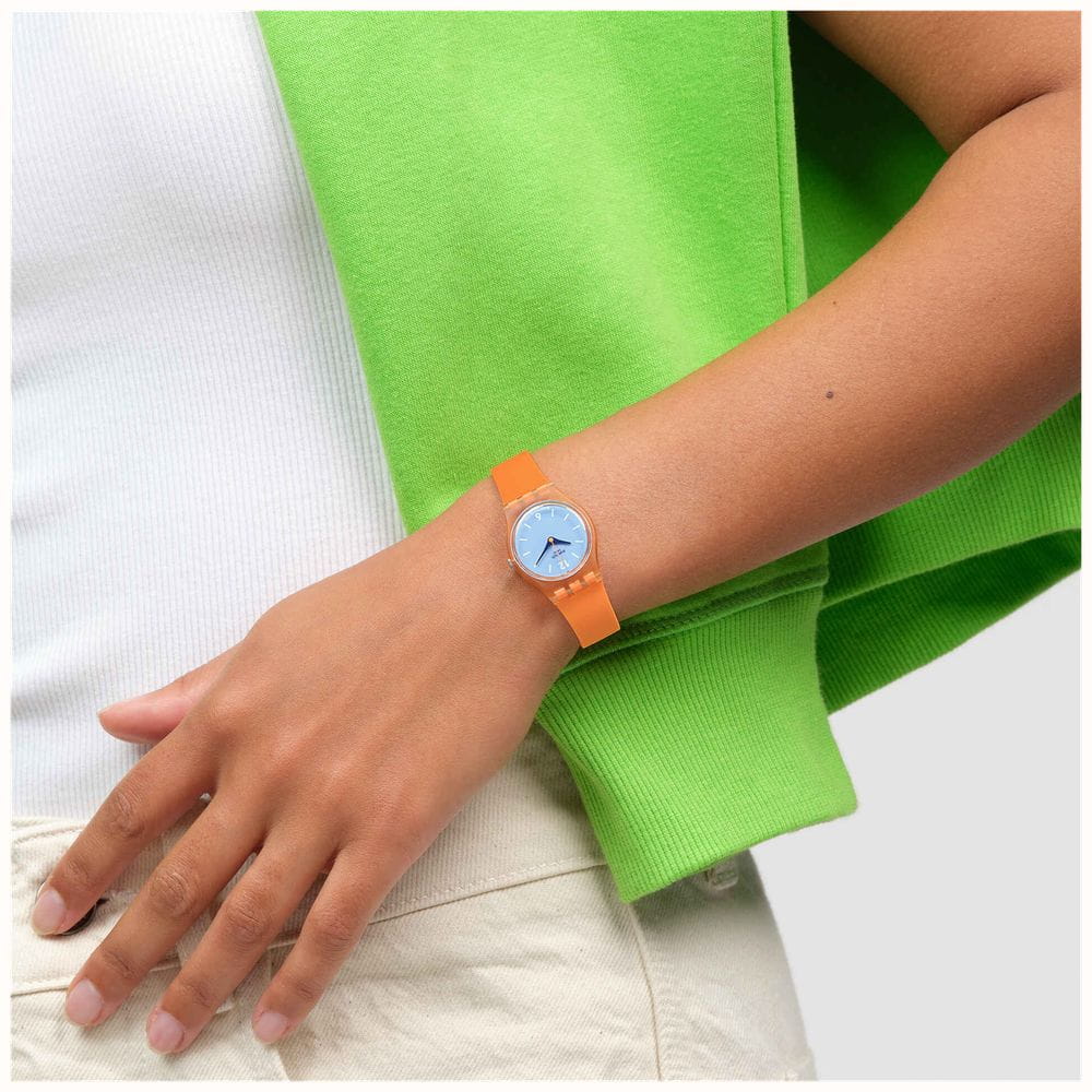 Озорная модель часов Swatch Lady LO116 из коллекции Swatch Lady. Эти часы имеют прозрачный корпус и голубой циферблат с белыми печатными цифрами и стрелками синего цвета, что придает им яркий и игривый вид. С лицевой стороны ремешок оранжевый, что добавляет оригинальности. Водостойкость модели составляет 30 метров, что делает их подходящими для повседневного использования.
