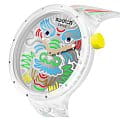 Часы Swatch SB05Z102 — это стильный и современный аксессуар для тех, кто ценит лёгкость и комфорт. Часы идеально подойдут как для мужчин, так и для женщин. Полупрозрачный корпус и стекло этих крупных часов изготовлены из биоматериала, а серебристый циферблат украшен цветным изображением дракона. Модель оснащена полупрозрачным матово-белым ремешком с красочным принтом, серебристой пряжкой и двумя тренчиками: белым с серебряной надписью и серебристым с красной. На часовую и минутную стрелки нанесено люминесцентное покрытиеЛюминесцентное покрытиеПозволяет считывать показания времени в темноте. Производители наносят на стрелки, часовые индексы, безель или поверхность циферблата светонакопительный состав, дающий холодное свечение., которое светится в темноте, создавая необычное изображение.  Водозащита 30 метров делает часы практичными для повседневного использования. Эти часы подойдут для повседневного ношения и станут ярким акцентом в вашем наряде.