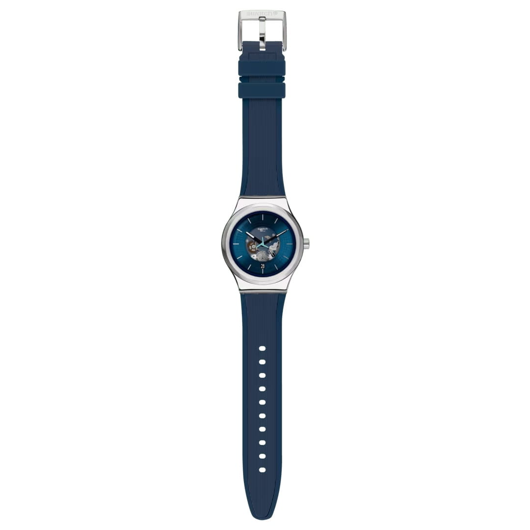 Часы Swatch YIS430 — это стильный и современный аксессуар для тех, кто ценит надежность и комфорт. Эти механические часы имеют синий циферблат радиальной полировкой и прозрачной вставкой. Стрелки с люминесцентным покрытиемЛюминесцентное покрытиеПозволяет считывать показания времени в темноте. Производители наносят на стрелки, часовые индексы, безель или поверхность циферблата светонакопительный состав, дающий холодное свечение.. Секундная стрелка необычной формы и бирюзового цвета. Окошко календаря расположено в положении 3 часов. Блестящий корпус из нержавеющей стали, а через заднюю крышку с цифровым принтом просматривается механизм SISTEM51. Модель оснащена автоматическим механизмом Sistem51, который состоит всего из 51 детали и имеет запас хода 90 часов.  Дополняет модель матовый синий ремешок из резины с классической застежкой. Водозащита 30 метров позволяет защитить корпус от случайных брызг или капель дождя, что делает часы практичными для повседневного использования. Эти часы станут ярким акцентом в вашем образе.