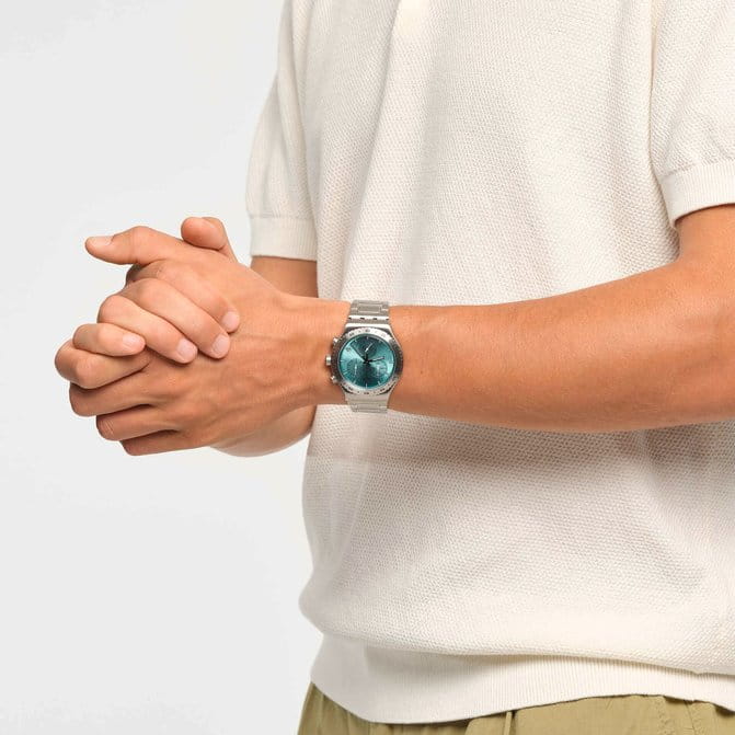 Часы Swatch YVS498G — это стильный и современный аксессуар для тех, кто ценит лёгкость и комфорт. Эта стильная модель часов из нержавеющей стали дополнена матовым металлическим браслетом из нержавеющей стали со съемными звеньями и застёжкой «бабочка»Застёжка "бабочка"Такой вид застёжки дополняется предохранителями, помогающими избежать случайного раскрытия браслета. Обладают изящным исполнением. . Бирюзовый циферблат с радиальной полировкой оснащен хронографомХронографФункция позволяет измерять отрезки времени с особой точностью: часы, минуты, секунды. Верным признаком хронографа является наличие на циферблате 3 дополнительных окошек-счётчиков. и светящимися в темноте индексами и стрелками из-за люминесцентного покрытияЛюминесцентное покрытиеПозволяет считывать показания времени в темноте. Производители наносят на стрелки, часовые индексы, безель или поверхность циферблата светонакопительный состав, дающий холодное свечение. заключен в матовый корпус из нержавеющей стали. Завершают образ индикатор даты в положении «4 часа» на циферблате, а также темно-серые цифры и индексы на безелеБезельВнешний ободок, закрепляющий стекло. В спортивных часах так называется поворотное кольцо с делениями на циферблате, выполняет роль таймера – замеряет отрезки времени на шкале. Неподвижный безель – элемент декора. Однонаправленно вращающийся безель на дайверских часах позволяет фиксировать моменты погружения и выныривания на поверхность. из нержавеющей стали. Водозащита 30 метров делает часы практичными для повседневного использования. Эти часы подойдут для повседневного ношения и станут ярким акцентом в вашем наряде.