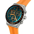 Часы Swatch YVS529 — это стильный и современный аксессуар для тех, кто ценит лёгкость и комфорт. Этот хронографХронографФункция позволяет измерять отрезки времени с особой точностью: часы, минуты, секунды. Верным признаком хронографа является наличие на циферблате 3 дополнительных окошек-счётчиков. из нержавеющей стали имеет синий циферблат с оранжевым принтом. Часовая и минутная стрелки серебристой расцветки, а также синяя секундная стрелка светятся в темноте из-за люминесцентного покрытияЛюминесцентное покрытиеПозволяет считывать показания времени в темноте. Производители наносят на стрелки, часовые индексы, безель или поверхность циферблата светонакопительный состав, дающий холодное свечение.. Часы заключены в матовый стальной корпус, оснащены стальным безелемБезельВнешний ободок, закрепляющий стекло. В спортивных часах так называется поворотное кольцо с делениями на циферблате, выполняет роль таймера – замеряет отрезки времени на шкале. Неподвижный безель – элемент декора. Однонаправленно вращающийся безель на дайверских часах позволяет фиксировать моменты погружения и выныривания на поверхность. с черным PVDPVDУльтратонкое покрытие наносится в технике вакуумного напыления, сочетает в себе нитрид титана особой прочности со слоем золота или оксида хрома. Несёт в себе декоративную или защитную функцию. покрытием и шкалой тахиметраТахиметрРазмеченная шкала, располагается на ободке или безеле часов. Тахиметр позволяет рассчитать скорость на определённом участке пути, расстояние измеряется в километрах или милях.. Модель дополнена броским оранжевым ремешком с тренчиками в тон и блестящей стальной полупряжкой. Водозащита 30 метров делает часы практичными для повседневного использования. Эти часы подойдут для повседневного ношения и станут ярким акцентом в вашем наряде.