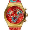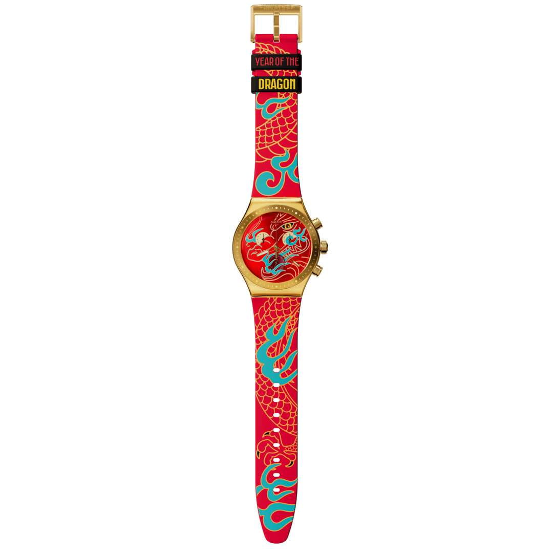 Часы Swatch YVZ100 — это стильный и современный аксессуар для тех, кто ценит лёгкость и комфорт. Этот красный хронографХронографФункция позволяет измерять отрезки времени с особой точностью: часы, минуты, секунды. Верным признаком хронографа является наличие на циферблате 3 дополнительных окошек-счётчиков. с блестящим золотым корпусом и безелемБезельВнешний ободок, закрепляющий стекло. В спортивных часах так называется поворотное кольцо с делениями на циферблате, выполняет роль таймера – замеряет отрезки времени на шкале. Неподвижный безель – элемент декора. Однонаправленно вращающийся безель на дайверских часах позволяет фиксировать моменты погружения и выныривания на поверхность. с PVDPVDУльтратонкое покрытие наносится в технике вакуумного напыления, сочетает в себе нитрид титана особой прочности со слоем золота или оксида хрома. Несёт в себе декоративную или защитную функцию. покрытием и такой же пряжкой на ремешке украшен изображением дракона. Цветной принт размещен как на циферблате с радиальной шлифовкой, так и на ремешке. На черные тренчики нанесены красная и золотистая надписи. На часовую и минутную стрелки нанесено люминесцентное покрытиеЛюминесцентное покрытиеПозволяет считывать показания времени в темноте. Производители наносят на стрелки, часовые индексы, безель или поверхность циферблата светонакопительный состав, дающий холодное свечение., которое светится в темноте, создавая необычное изображение. Водозащита 30 метров делает часы практичными для повседневного использования. Эти часы подойдут для повседневного ношения и станут ярким акцентом в вашем наряде.