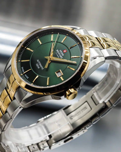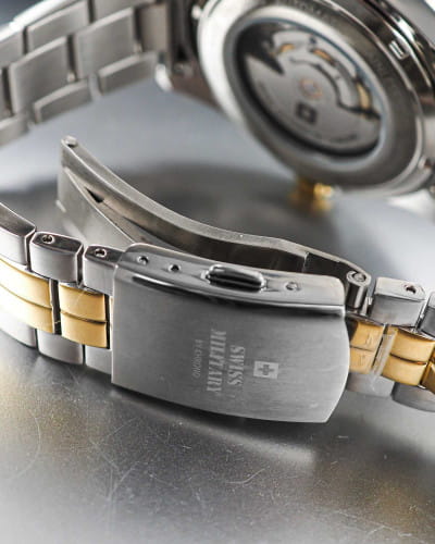 Мужские швейцарские наручные часы Swiss Military by Chrono SMA34085.39, механический механизм (автоматический калибр) с высокой точностью. Сапфировое стеклоСапфировое стеклоПрочный и надёжный материал из кристалла сапфира синтетического происхождения, характеризующийся особой твёрдостью и устойчивостью к царапинам и повреждениям. устойчивое к появлению царапин, обладающее высокой прозрачностью. Класс водозащиты: 100 метров, позволит плавать, нырять и заниматься другими водными видами спорта. Корпус часов изготовлен из стали с частичным PVD-покрытиемPVDУльтратонкое покрытие наносится в технике вакуумного напыления, сочетает в себе нитрид титана особой прочности со слоем золота или оксида хрома. Несёт в себе декоративную или защитную функцию., цвета желтое золото. Люминесцентная подсветкаЛюминесцентное покрытиеПозволяет считывать показания времени в темноте. Производители наносят на стрелки, часовые индексы, безель или поверхность циферблата светонакопительный состав, дающий холодное свечение. стрелок. Браслет с раскладной застёжкойРаскладная застёжкаТакой тип застёжки используется только на браслетах из металла. Она никогда не раскрывается полностью, происходит разделение на 2 и более частей. Раскладывающая застёжка снизит вероятность потери часов к минимуму..