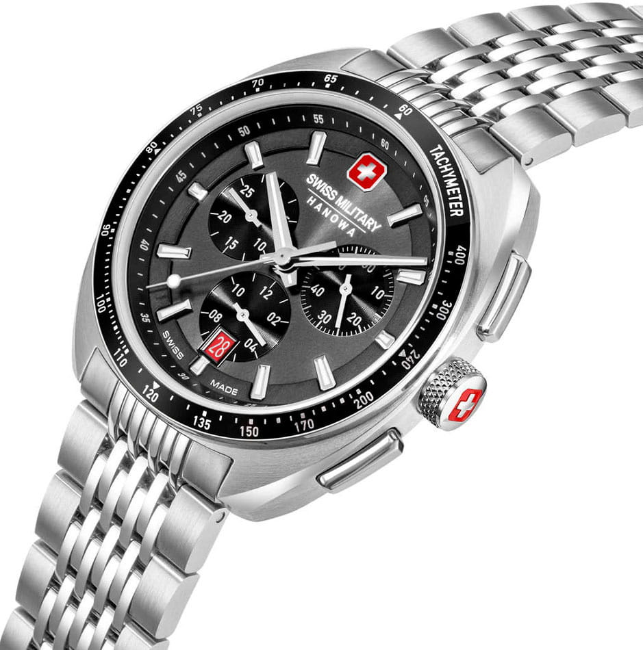 Мужские швейцарские часы-хронографХронографФункция позволяет измерять отрезки времени с особой точностью: часы, минуты, секунды. Верным признаком хронографа является наличие на циферблате 3 дополнительных окошек-счётчиков. Swiss Military Hanowa SMWGI0003302, кварцевый механизм с высокой точностью. Сапфировое стеклоСапфировое стеклоПрочный и надёжный материал из кристалла сапфира синтетического происхождения, характеризующийся особой твёрдостью и устойчивостью к царапинам и повреждениям. устойчивое к появлению царапин, обладающее высокой прозрачностью. Класс водозащиты: 100 метров, позволит плавать, нырять и заниматься другими водными видами спорта. Корпус часов изготовлен из стали. Стальной браслет на раскладной застёжкеРаскладная застёжкаТакой тип застёжки используется только на браслетах из металла. Она никогда не раскрывается полностью, происходит разделение на 2 и более частей. Раскладывающая застёжка снизит вероятность потери часов к минимуму.. БезельБезельВнешний ободок, закрепляющий стекло. В спортивных часах так называется поворотное кольцо с делениями на циферблате, выполняет роль таймера – замеряет отрезки времени на шкале. Неподвижный безель – элемент декора. Однонаправленно вращающийся безель на дайверских часах позволяет фиксировать моменты погружения и выныривания на поверхность. с тахиметромТахиметрРазмеченная шкала, располагается на ободке или безеле часов. Тахиметр позволяет рассчитать скорость на определённом участке пути, расстояние измеряется в километрах или милях. изготовлен из нержавеющей стали с IP-покрытиемIP-покрытиеМетод ионного напыления. Демонстрирует повышенную устойчивость к истиранию, окислению и химическим веществам. Под воздействием высокого давления и температуры около 1500°C молекулы металла надёжно соединяются с частицами корпуса часов..
