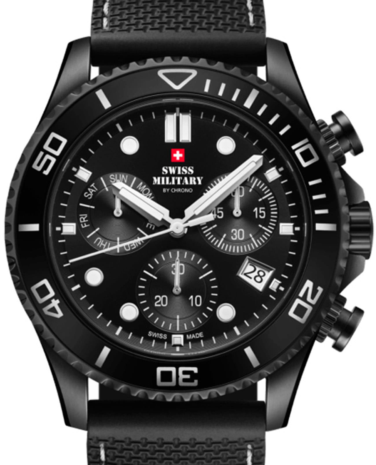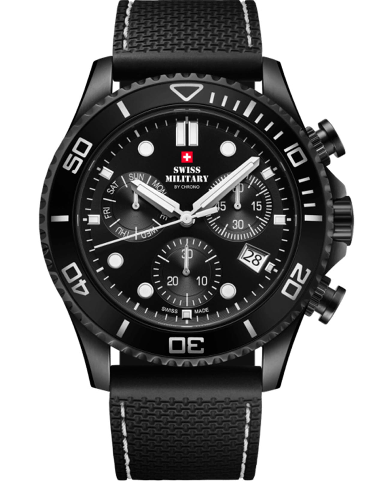 Часы Swiss Military SM34101.07 — это стильный мужской хронограф, который сочетает швейцарское качество и функциональность. Корпус диаметром 46 мм выполнен из нержавеющей стали с чёрным PVD-покрытиемPVDУльтратонкое покрытие наносится в технике вакуумного напыления, сочетает в себе нитрид титана особой прочности со слоем золота или оксида хрома. Несёт в себе декоративную или защитную функцию., что придаёт часам современный и прочный вид. Чёрный циферблат с люминесцентными стрелкамиЛюминесцентное покрытиеПозволяет считывать показания времени в темноте. Производители наносят на стрелки, часовые индексы, безель или поверхность циферблата светонакопительный состав, дающий холодное свечение. и метками обеспечивает превосходную читаемость даже в условиях низкой освещённости. Циферблат защищён сапфировым стекломСапфировое стеклоПрочный и надёжный материал из кристалла сапфира синтетического происхождения, характеризующийся особой твёрдостью и устойчивостью к царапинам и повреждениям., устойчивым к царапинам.