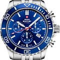 Модель оснащена вращающимся безелемБезельВнешний ободок, закрепляющий стекло. В спортивных часах так называется поворотное кольцо с делениями на циферблате, выполняет роль таймера – замеряет отрезки времени на шкале. Неподвижный безель – элемент декора. Однонаправленно вращающийся безель на дайверских часах позволяет фиксировать моменты погружения и выныривания на поверхность. синего цвета, что добавляет дополнительную функциональность. Водозащита до 10 ATM делает часы подходящими для плавания и других водных активностей. Швейцарский кварцевый механизм Ronda 5040.D обеспечивает высокую точность измерения времени и функции хронографа.