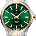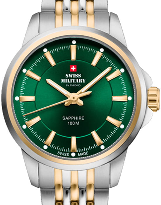 Часы Swiss Military SM34105.06 — это элегантный женский аксессуар, объединяющий классический стиль и швейцарское качество. Корпус диаметром 28 мм выполнен из нержавеющей стали с двухцветным покрытиемPVDУльтратонкое покрытие наносится в технике вакуумного напыления, сочетает в себе нитрид титана особой прочности со слоем золота или оксида хрома. Несёт в себе декоративную или защитную функцию., что придаёт часам утончённый и стильный вид. Зелёный циферблат с солнечным узором украшен золотистыми индексами и стрелками, которые обеспечивают отличную читаемость. Циферблат защищён сапфировым стекломСапфировое стеклоПрочный и надёжный материал из кристалла сапфира синтетического происхождения, характеризующийся особой твёрдостью и устойчивостью к царапинам и повреждениям., устойчивым к царапинам.