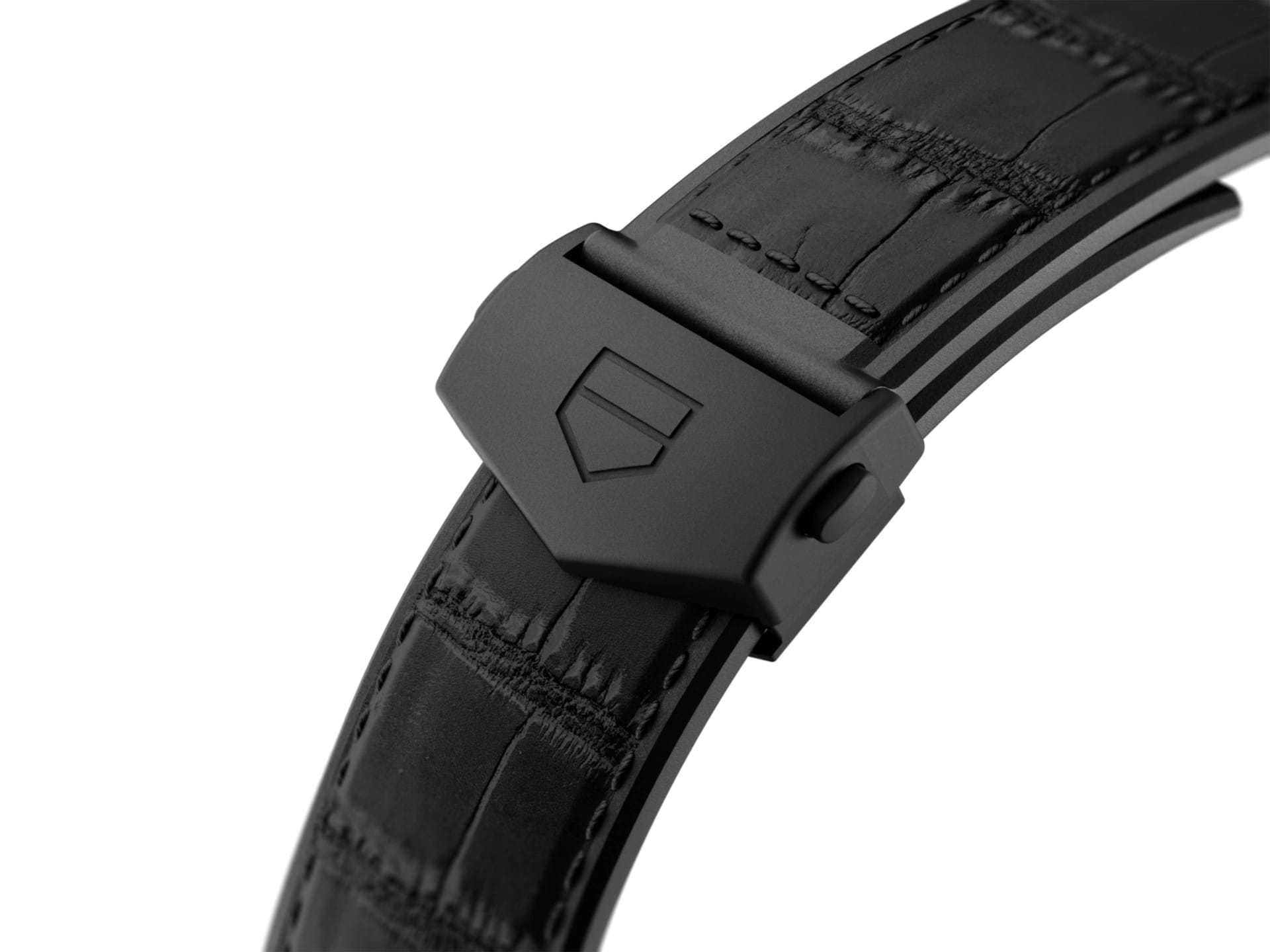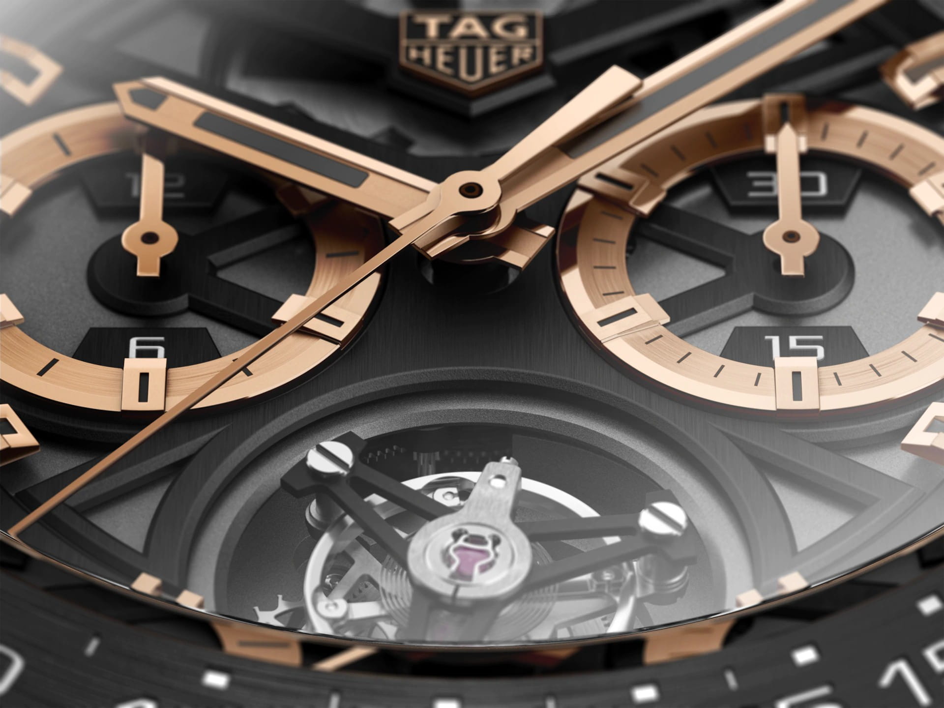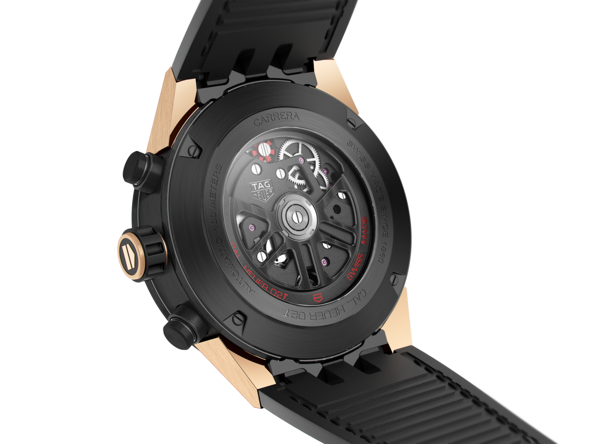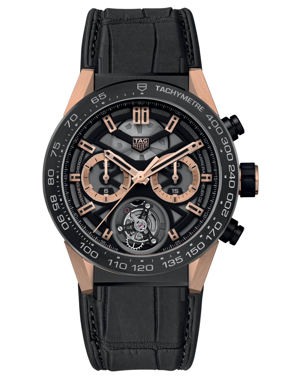 Версия TAG Heuer Carrera Tourbillon Chronograph из розового золота с черным скелетонизированным циферблатом, титановым корпусом, керамическим безелем и креплениями из розового золота. Тщательно прошитый ремешок из матовой черной кожи аллигатора с черной каучуковой подкладкой. TAG Heuer Carrera CAR5A5U.FC6377, механический механизм (автоматический калибр) с высокой точностью. Сапфировое стекло устойчивое к появлению царапин, обладающее высокой прозрачностью. Класс водозащиты: 100 метров, позволит плавать, нырять и заниматься другими водными видами спорта. Корпус часов изготовлен из титана, цвета.