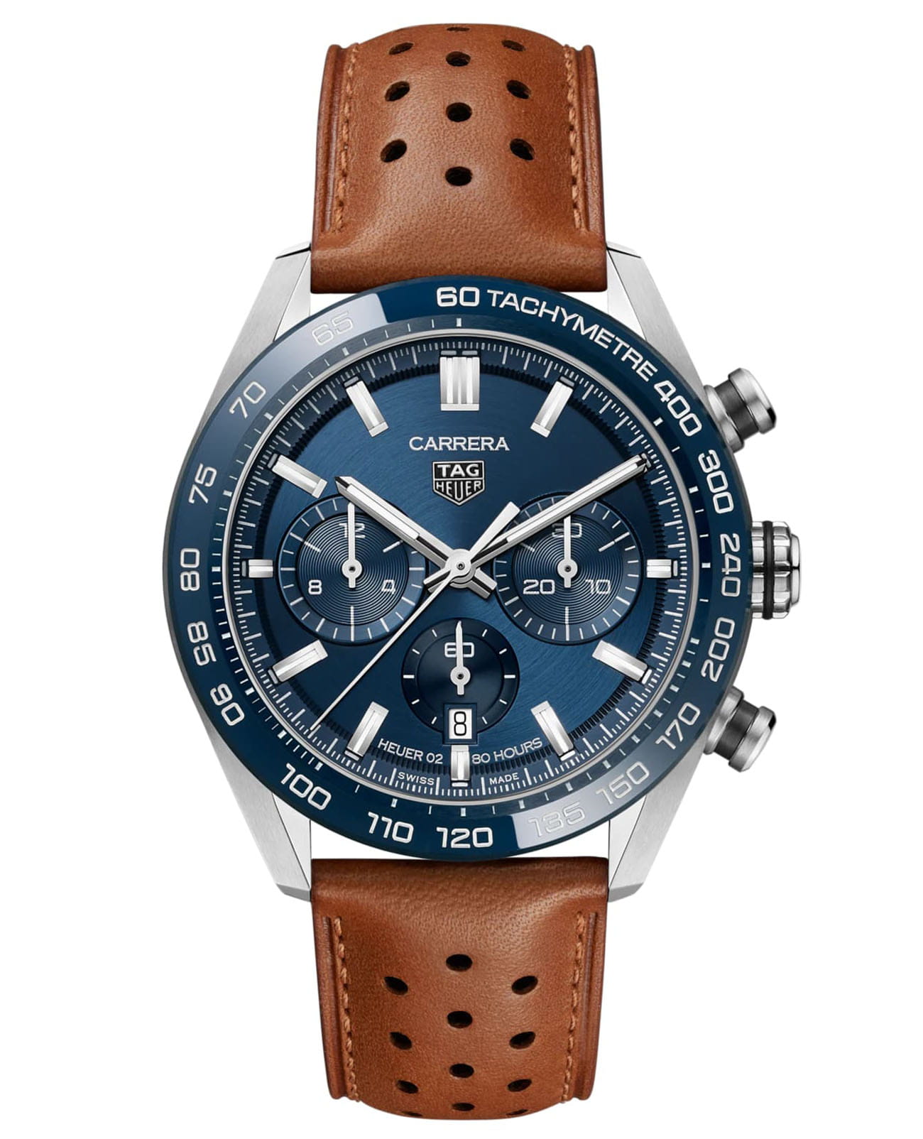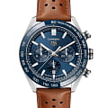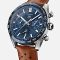 Фирменный дизайн этих роскошных часов TAG Heuer Carrera доведен до совершенства благодаря перфорированному коричневому ремешку из телячьей кожи и синей подкладке в тон циферблату и безелю. Часы TAG Heuer Carrera, вдохновленные автомобильными гонками, отличаются смелым и дерзким духом и эффектным ремешком из телячьей кожи со спортивной перфорацией, создающими неповторимый образ. Часы-хронографХронографФункция позволяет измерять отрезки времени с особой точностью: часы, минуты, секунды. Верным признаком хронографа является наличие на циферблате 3 дополнительных окошек-счётчиков. с корпусом из полированной и матовой стали диаметром 44 мм выглядит напористо, а синий циферблат и соответствующий керамический безельБезельВнешний ободок, закрепляющий стекло. В спортивных часах так называется поворотное кольцо с делениями на циферблате, выполняет роль таймера – замеряет отрезки времени на шкале. Неподвижный безель – элемент декора. Однонаправленно вращающийся безель на дайверских часах позволяет фиксировать моменты погружения и выныривания на поверхность. придают ему городской вид. Сквозь заднюю крышку из сапфирового стеклаСапфировое стеклоПрочный и надёжный материал из кристалла сапфира синтетического происхождения, характеризующийся особой твёрдостью и устойчивостью к царапинам и повреждениям. вы можете увидеть Калибр HEUER 02 Automatic, технический механизм, который идеально сочетается с этой великой классикой.