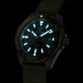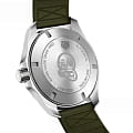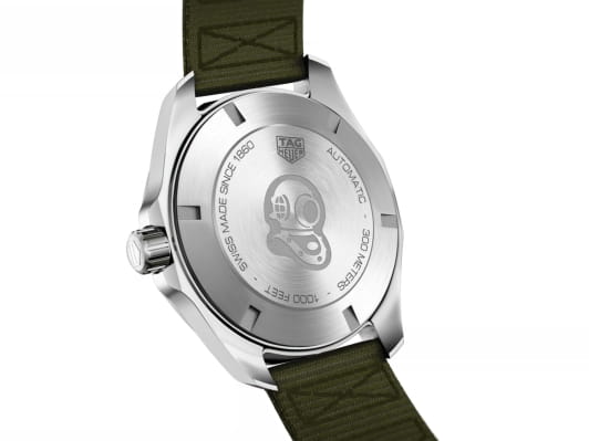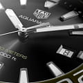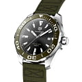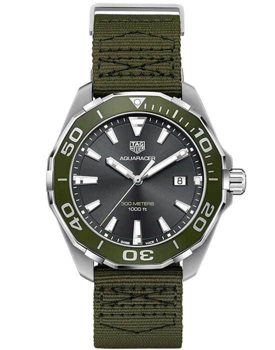 TAG Heuer Aquaracer WAY101L.FC8222 – элегантные мужские часы, сочетающие стиль и функциональность. Корпус диаметром 43 мм выполнен из нержавеющей стали с безелемБезельВнешний ободок, закрепляющий стекло. В спортивных часах так называется поворотное кольцо с делениями на циферблате, выполняет роль таймера – замеряет отрезки времени на шкале. Неподвижный безель – элемент декора. Однонаправленно вращающийся безель на дайверских часах позволяет фиксировать моменты погружения и выныривания на поверхность. из алюминия и стали с PVD-покрытиемPVDУльтратонкое покрытие наносится в технике вакуумного напыления, сочетает в себе нитрид титана особой прочности со слоем золота или оксида хрома. Несёт в себе декоративную или защитную функцию., устойчивым к царапинам. Тёмно-зелёный циферблат с солнечным узором оснащён накладными часовыми метками и стрелками с люминесцентным покрытиемЛюминесцентное покрытиеПозволяет считывать показания времени в темноте. Производители наносят на стрелки, часовые индексы, безель или поверхность циферблата светонакопительный состав, дающий холодное свечение., обеспечивающим отличную читаемость в любых условиях освещения. Часы оснащены точным кварцевым механизмом, гарантирующим надёжное отображение времени. Функциональность включает индикацию часов, минут, секунд и даты, расположенной на отметке «3 часа». Сапфировое стеклоСапфировое стеклоПрочный и надёжный материал из кристалла сапфира синтетического происхождения, характеризующийся особой твёрдостью и устойчивостью к царапинам и повреждениям. с антибликовым покрытиемАнтибликовое покрытиеСлой оксида металла в 0,13-0,3 микрон, благодаря которому стекло часов не бликует и не отражает свет. Антибликовое покрытие уменьшает отражение света в 10 раз, обеспечивая отличную читаемость показателей циферблата. обеспечивает защиту от царапин и превосходную читаемость. Тёмно-зелёный нейлоновый ремешок оснащён классической застёжкой-пряжкой из нержавеющей стали. Водозащита до 300 метров (30 бар) делает модель подходящей для дайвинга и других водных видов спорта.