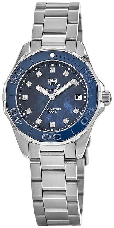 TAG Heuer Aquaracer WAY131L.BA0748 — элегантные женские часы, сочетающие стиль и функциональность. Корпус диаметром 35 мм и толщиной 10,75 мм выполнен из полированной нержавеющей стали, обеспечивая долговечность и устойчивость к коррозии. Лакированный циферблат оснащён накладными часовыми метками и стрелками с люминесцентным покрытиемЛюминесцентное покрытиеПозволяет считывать показания времени в темноте. Производители наносят на стрелки, часовые индексы, безель или поверхность циферблата светонакопительный состав, дающий холодное свечение., обеспечивающим отличную читаемость в любых условиях освещения. Его поверхность защищена сапфировым стекломСапфировое стеклоПрочный и надёжный материал из кристалла сапфира синтетического происхождения, характеризующийся особой твёрдостью и устойчивостью к царапинам и повреждениям., устойчивым к царапинам. Циферблат украшен 11 бриллиантами. Часы оснащены точным кварцевым механизмом, обеспечивающим стабильное отображение времени. Функциональность включает индикацию часов, минут, секунд и даты, расположенной на отметке «3 часа». БезельБезельВнешний ободок, закрепляющий стекло. В спортивных часах так называется поворотное кольцо с делениями на циферблате, выполняет роль таймера – замеряет отрезки времени на шкале. Неподвижный безель – элемент декора. Однонаправленно вращающийся безель на дайверских часах позволяет фиксировать моменты погружения и выныривания на поверхность. однонаправленный вращающийся, выполнен из стали, устойчивой к царапинам. Водозащита до 300 метров (30 бар) делает модель подходящей для дайвинга и активного образа жизни. Стальной браслет на раскладной застёжкеРаскладная застёжкаТакой тип застёжки используется только на браслетах из металла. Она никогда не раскрывается полностью, происходит разделение на 2 и более частей. Раскладывающая застёжка снизит вероятность потери часов к минимуму..