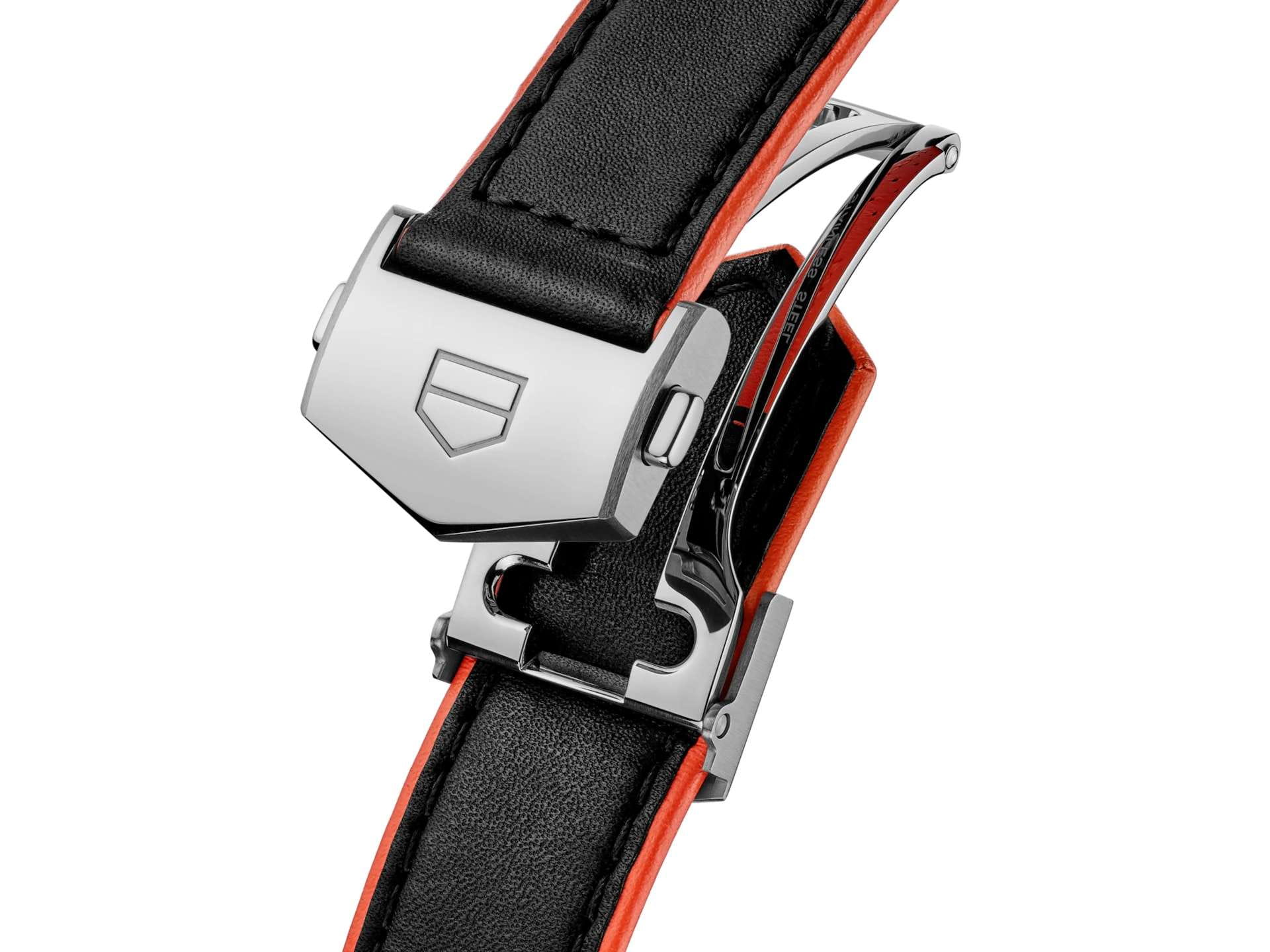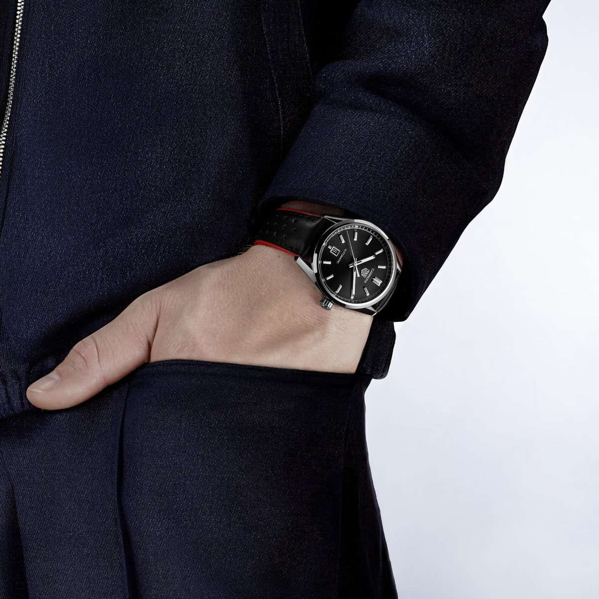 TAG Heuer Carrera Date WBN2110.FC6623 - сочетают в себе яркий характер и современный стиль. Чёрный циферблат с отделкой Azurage, автоматический механизм Calibre 5 обеспечивает стабильную работу. Корпус из полированной и сатинированной стали диаметром 39 мм предлагают отличную считываемость показаний  – идеальный выбор для тех, кто ценит элегантность и функциональность. Сапфировое стеклоСапфировое стеклоПрочный и надёжный материал из кристалла сапфира синтетического происхождения, характеризующийся особой твёрдостью и устойчивостью к царапинам и повреждениям. с антибликовым покрытиемАнтибликовое покрытиеСлой оксида металла в 0,13-0,3 микрон, благодаря которому стекло часов не бликует и не отражает свет. Антибликовое покрытие уменьшает отражение света в 10 раз, обеспечивая отличную читаемость показателей циферблата. устойчивое к появлению царапин, обладающее высокой прозрачностью. Стрелки с люминесцентным покрытиемЛюминесцентное покрытиеПозволяет считывать показания времени в темноте. Производители наносят на стрелки, часовые индексы, безель или поверхность циферблата светонакопительный состав, дающий холодное свечение. Super-LumiNova® — для превосходной читаемости в любых условиях. Аккуратное окошко даты на отметке «6 часов» сохраняет гармоничные пропорции корпуса. Спортивный кожаный ремешок с раскладной застёжкойРаскладная застёжкаТакой тип застёжки используется только на браслетах из металла. Она никогда не раскрывается полностью, происходит разделение на 2 и более частей. Раскладывающая застёжка снизит вероятность потери часов к минимуму. и оранжевыми акцентами придают модели вневременную привлекательность. Класс водозащиты: 100 метров позволит плавать, нырять и заниматься другими водными видами спорта.