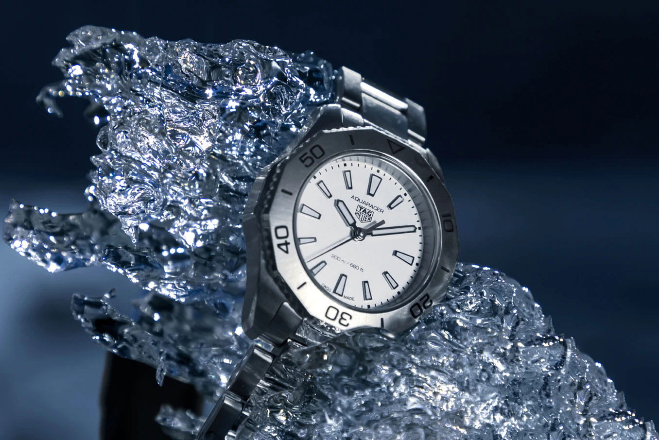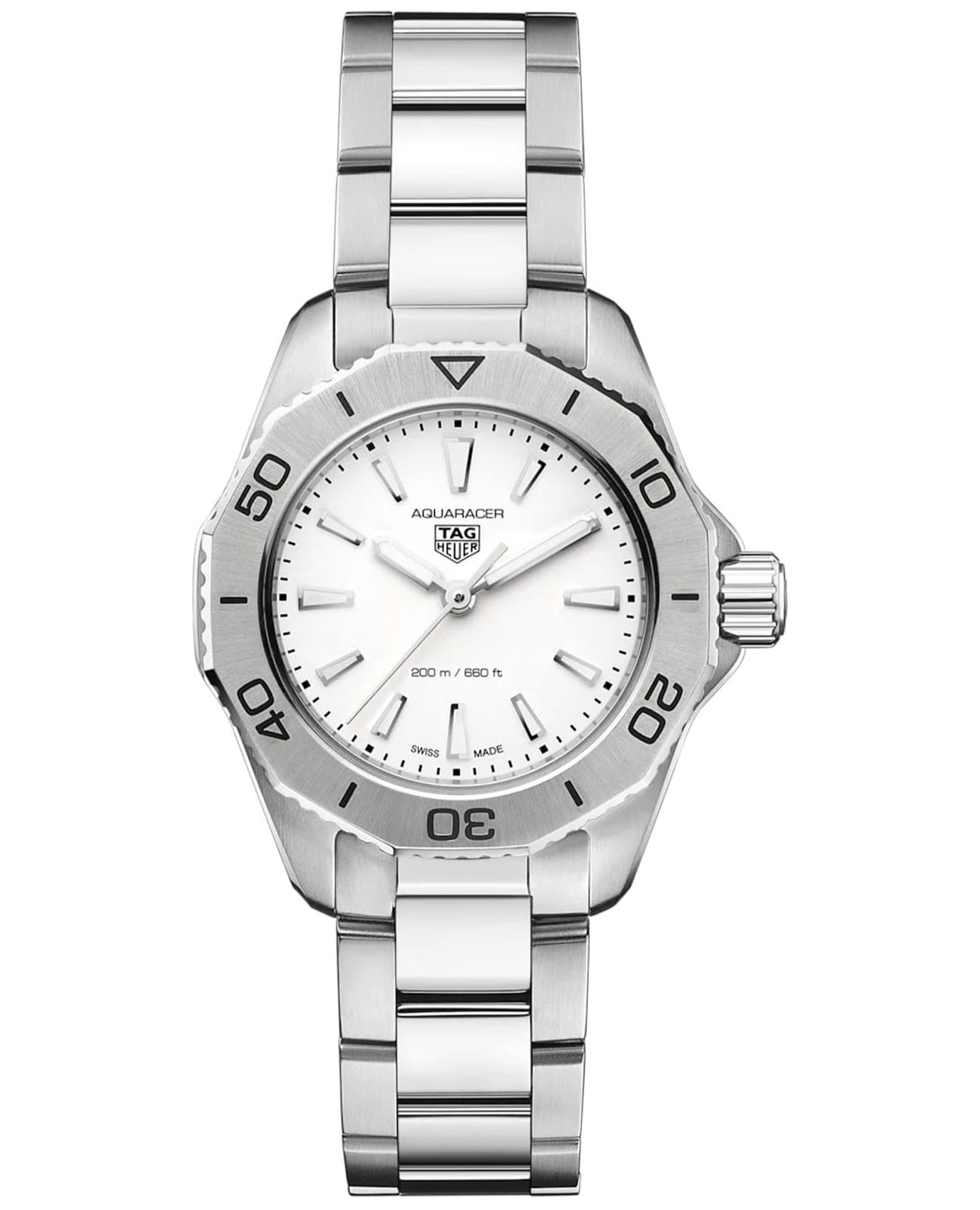 Женские швейцарские часы TAG Heuer Aquaracer Professional 200 WBP1411.BA0622, кварцевый механизм с высокой точностью. Сапфировое стеклоСапфировое стеклоПрочный и надёжный материал из кристалла сапфира синтетического происхождения, характеризующийся особой твёрдостью и устойчивостью к царапинам и повреждениям. устойчивое к появлению царапин, обладающее высокой прозрачностью. Класс водозащиты: 200 метров, позволит плавать, нырять и заниматься другими водными видами спорта. Корпус часов изготовлен из стали. Стальной браслет на раскладной застёжкеРаскладная застёжкаТакой тип застёжки используется только на браслетах из металла. Она никогда не раскрывается полностью, происходит разделение на 2 и более частей. Раскладывающая застёжка снизит вероятность потери часов к минимуму.. Стальной рифленый вращающийся 12-гранный безельБезельВнешний ободок, закрепляющий стекло. В спортивных часах так называется поворотное кольцо с делениями на циферблате, выполняет роль таймера – замеряет отрезки времени на шкале. Неподвижный безель – элемент декора. Однонаправленно вращающийся безель на дайверских часах позволяет фиксировать моменты погружения и выныривания на поверхность. с минутной шкалой выполнен с радиальным сатинированием поверхности. Циферблат выполнен по технологии Sunray (солнечные лучи). Метки в виде штрихов. Стрелки и метки с родиевым и люминесцентным покрытиемЛюминесцентное покрытиеПозволяет считывать показания времени в темноте. Производители наносят на стрелки, часовые индексы, безель или поверхность циферблата светонакопительный состав, дающий холодное свечение. Superluminova. Рифленая заводная головка с защитой. Задняя крышка украшена выгравированной 8-лучевой розой ветров на фоне узора сотовой структуры.