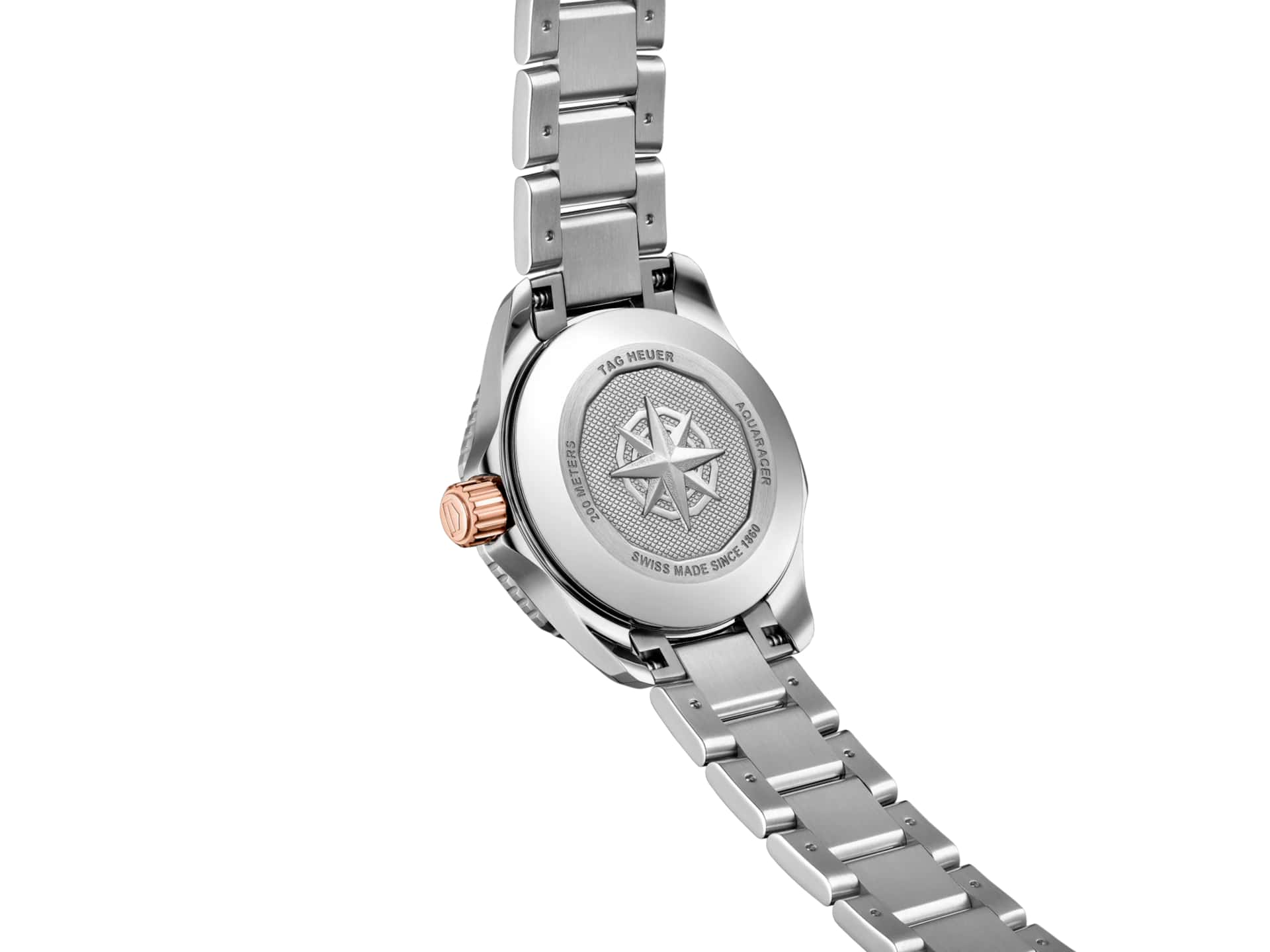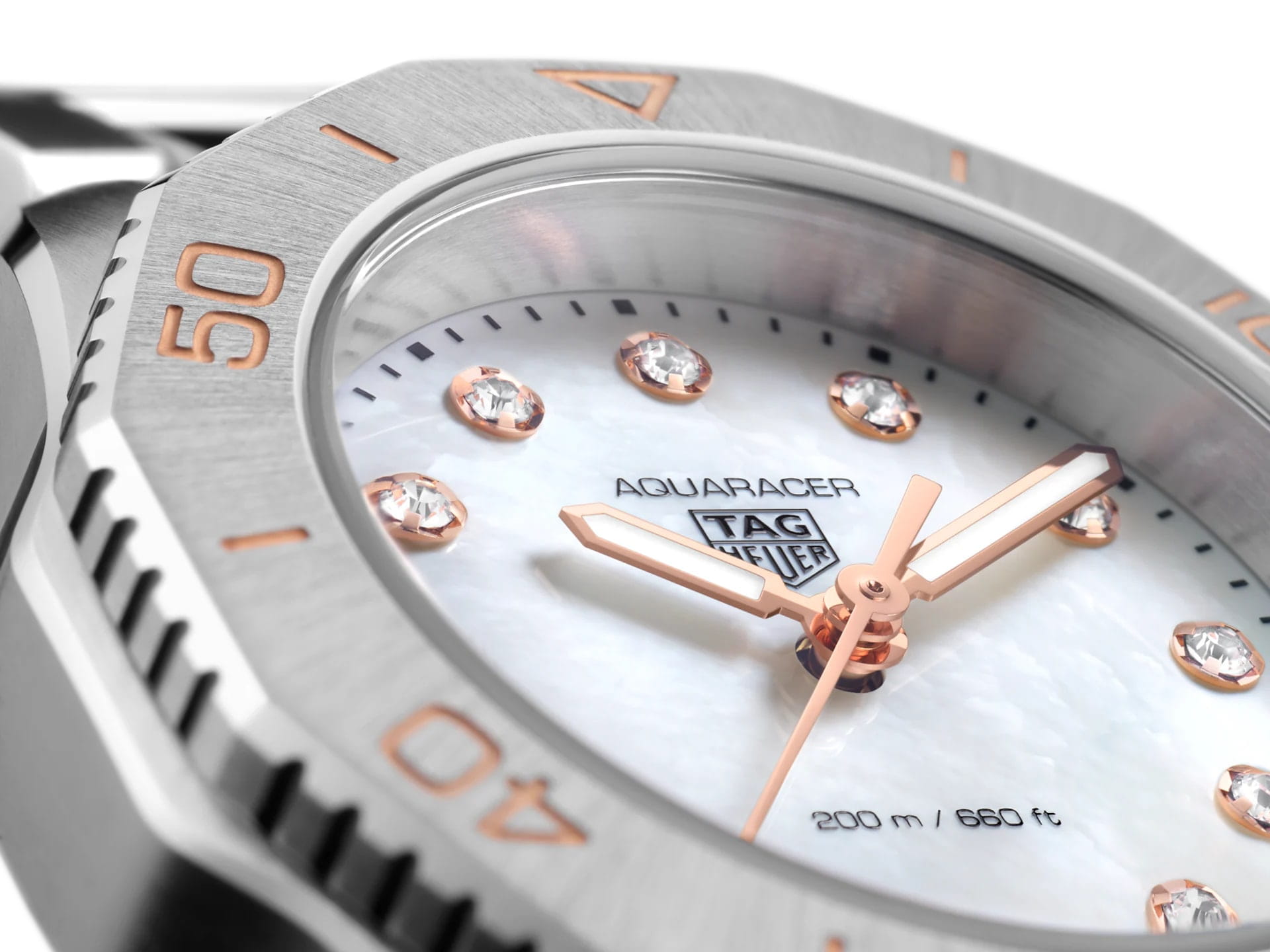 5N. Эти универсальные и надежные часы готовы принять любой вызов. Потрясающий перламутровый циферблат украшен 12 бриллиантами классической огранки VS (диаметр 1,40 мм, 0,117 карата), часовыми метками и контрастными стрелками и индексами с покрытием из розового золота 18 карат 5N. Эти 30-миллиметровые часы TAG Heuer Aquaracer, созданные на века, оснащены точным кварцевым калибром, а корпус из нержавеющей стали рассчитан на 200M. Циферблат с люминесцентным покрытиемЛюминесцентное покрытиеПозволяет считывать показания времени в темноте. Производители наносят на стрелки, часовые индексы, безель или поверхность циферблата светонакопительный состав, дающий холодное свечение. стрелок и меток, дополнен сапфировым стекломСапфировое стеклоПрочный и надёжный материал из кристалла сапфира синтетического происхождения, характеризующийся особой твёрдостью и устойчивостью к царапинам и повреждениям., устойчивым к появлению царапин и обладающее высокой прозрачностью.