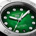 Женские механические швейцарские часы TAG Heuer Aquaracer Professional 200 WBP2415.BA0622, механический механизм (автоматический калибр) с высокой точностью. Сапфировое стеклоСапфировое стеклоПрочный и надёжный материал из кристалла сапфира синтетического происхождения, характеризующийся особой твёрдостью и устойчивостью к царапинам и повреждениям. устойчивое к появлению царапин, обладающее высокой прозрачностью. Класс водозащиты: 200 метров, позволит плавать, нырять и заниматься другими водными видами спорта. Корпус часов изготовлен из стали. Стальной браслет на раскладной застёжкеРаскладная застёжкаТакой тип застёжки используется только на браслетах из металла. Она никогда не раскрывается полностью, происходит разделение на 2 и более частей. Раскладывающая застёжка снизит вероятность потери часов к минимуму.. Изделие дополнено 11 бриллиантами VS классической огранки диаметром 1,40 мм (0,107 карата) в качестве часовых меток. Стрелки с люминесцентным покрытиемЛюминесцентное покрытиеПозволяет считывать показания времени в темноте. Производители наносят на стрелки, часовые индексы, безель или поверхность циферблата светонакопительный состав, дающий холодное свечение.. Окошко даты находится в положении 6 часов.