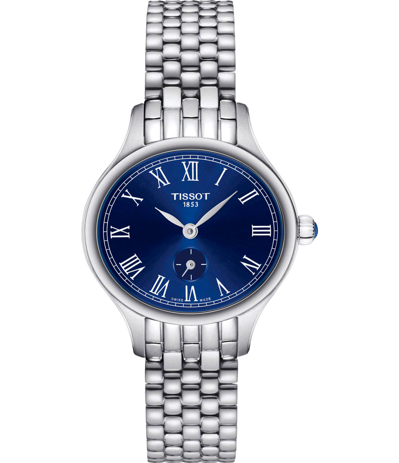 На заводной головке расположился утончённый синий кабашон в тон циферблату, придающий модели женственный облик. Дополнительное очарование достигается благодаря плавным контурам и вогнутому безелюБезельВнешний ободок, закрепляющий стекло. В спортивных часах так называется поворотное кольцо с делениями на циферблате, выполняет роль таймера – замеряет отрезки времени на шкале. Неподвижный безель – элемент декора. Однонаправленно вращающийся безель на дайверских часах позволяет фиксировать моменты погружения и выныривания на поверхность.. Высокоточный кварцевый механизм ETA 980.153. Стальной браслет с ювелирной отделкой. Отдельный мини-счётчик секунд. Сапфировое стекло отличается устойчивостью к царапинам.. Функция EOLEOLПредставляет собой систему, уведомляющую владельца часов о необходимости замены элемента питания. За 2 недели до полного разряда батарейки секундная стрелка перестаёт ходить чётко и начинает перепрыгивать на 3-4 деления.. Габариты: 24,4 x 27,2 x 7,7 мм.
