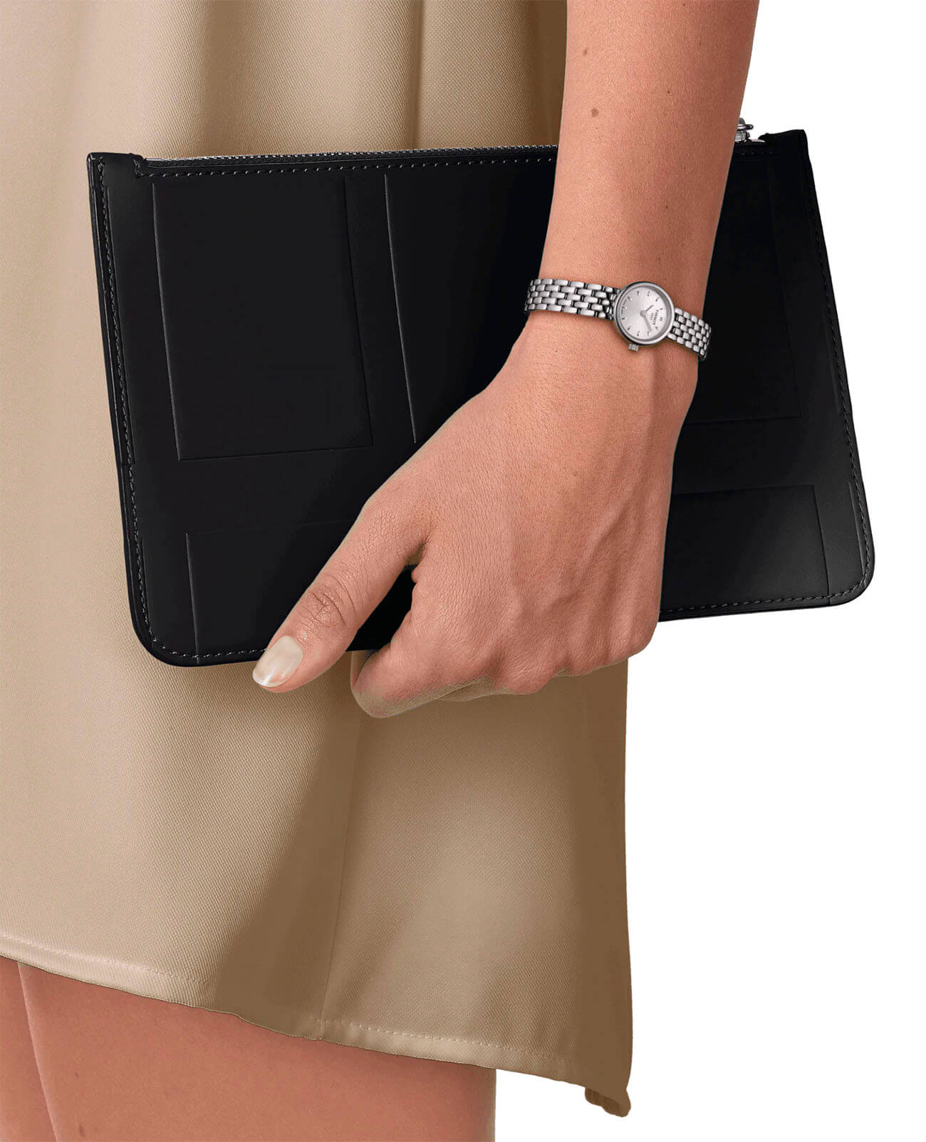 Серебристая модель имеет отличительную особенность - браслет оригинального плетения, который свободно сидит на запястье. Благодаря этому часы выглядят как ювелирное украшение. В остальном аксессуар отличается минимализмом, лаконичный циферблат, тонкие стрелки, отсутствие декора. Кварцевый калибр ETA 901.001 с высокой точностью хода. Сапфировое стекло, устойчивое к появлению царапин на поверхности. Долговечная нержавеющая сталь. Габариты: 19,5 x 19,5 x 5 мм.