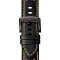 Расставлены жёлтые и фиолетовые цветовые акценты, чёрный циферблат украшен логотипом команды, такой аксессуар станет лучшим подарком для фанатов NBA. Идеально смотрится ремешок из натуральной кожи с перфорацией, задняя крышка дополнена эмблемой NBA. Высокоточный кварцевый механизм ETA G10.212. Чёрное PVD-покрытиеPVDУльтратонкое покрытие наносится в технике вакуумного напыления, сочетает в себе нитрид титана особой прочности со слоем золота или оксида хрома. Несёт в себе декоративную или защитную функцию. стального корпуса. Водонепроницаемость при давлении 10 бар. Люминесцентная подсветкаЛюминесцентное покрытиеПозволяет считывать показания времени в темноте. Производители наносят на стрелки, часовые индексы, безель или поверхность циферблата светонакопительный состав, дающий холодное свечение.. ХронографХронографФункция позволяет измерять отрезки времени с особой точностью: часы, минуты, секунды. Верным признаком хронографа является наличие на циферблате 3 дополнительных окошек-счётчиков., секундомер, индикация текущего числа. Габариты: 45 x 45 x 11 мм.