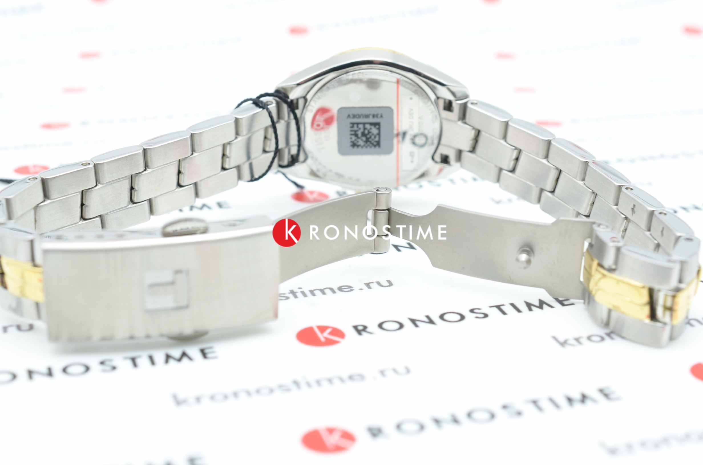 Дизайнеры придали модели немного шарма за счёт корпуса браслета с золотистым PVD-покрытием и минималистичного перламутрового циферблата. Часы оснащены высокоточным кварцевым калибром ETA F03.111, не нуждаются в заводе. Стрелки с люминесцентным покрытиемЛюминесцентное покрытиеПозволяет считывать показания времени в темноте. Производители наносят на стрелки, часовые индексы, безель или поверхность циферблата светонакопительный состав, дающий холодное свечение.. Сапфировое стекло противостоит появлению царапин. Водостойкость до 10 бар. . Индикация числа, функция EOLEOLПредставляет собой систему, уведомляющую владельца часов о необходимости замены элемента питания. За 2 недели до полного разряда батарейки секундная стрелка перестаёт ходить чётко и начинает перепрыгивать на 3-4 деления.. Габариты: 25 x 25 x 6,9 мм.