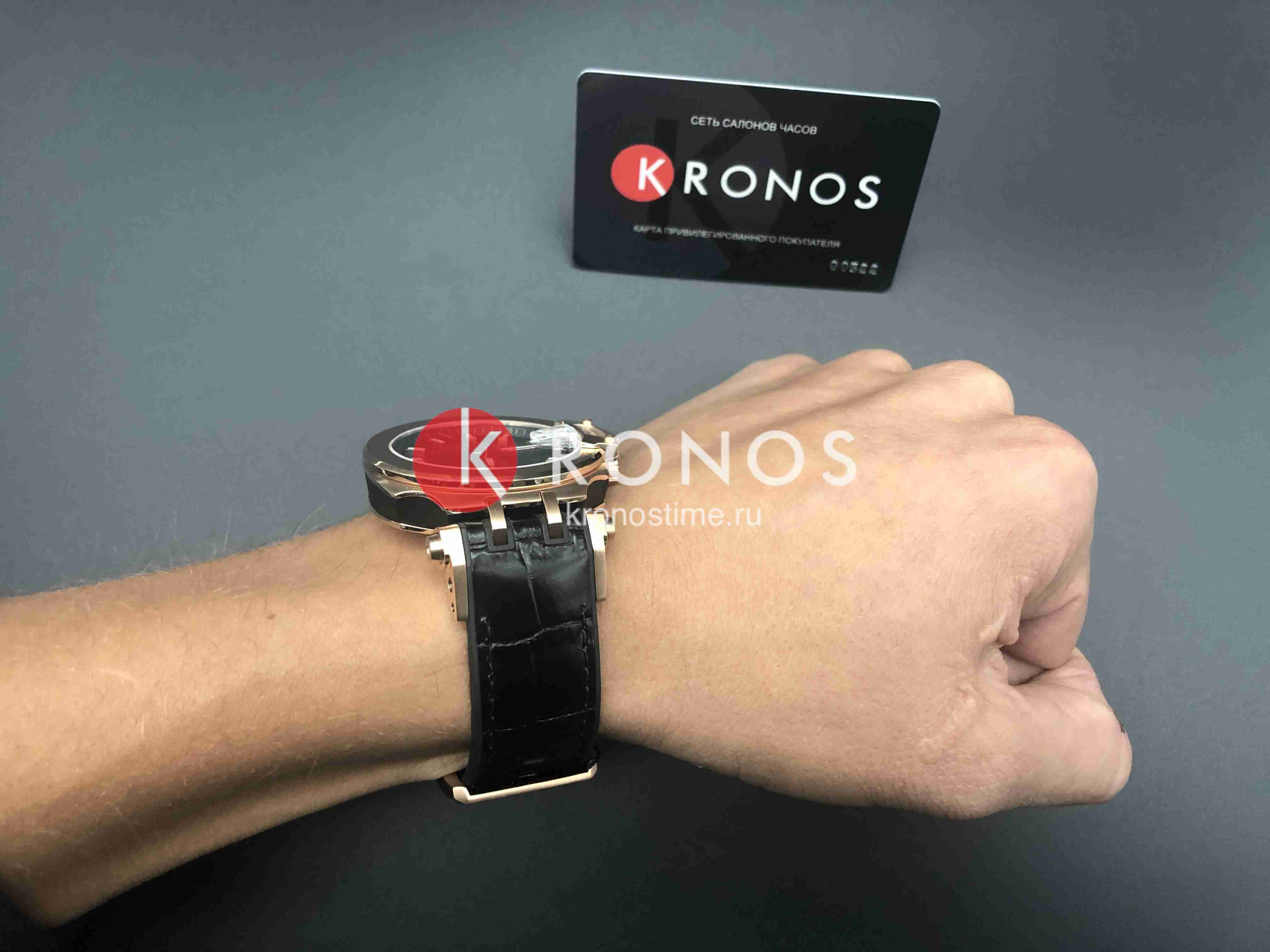 Наручные часы оформлены в стиле гоночных мотоциклов, присутствуют эффектные спортивные элементы. Внушительный корпус с надёжным PVD-покрытием имеет диаметр 45 мм, что делает его идеальным вариантом для широкого запястья. Швейцарский механизм Swissmatic с запасом хода 72 часа. Скелетонизированная задняя крышка. Сапфировое стекло. Ремешок из натуральной кожи с тиснением под кожу крокодила. Габариты: 48,8 x 45 x 13,04 мм.
