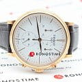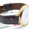 Модель не отличается богатым декором или броскими деталями, её особенность заключается в наличии полезного функционала и минималистичном строгом дизайне. Наручные часы привлекают золотистыми переливами корпуса с PVD-покрытиемPVDУльтратонкое покрытие наносится в технике вакуумного напыления, сочетает в себе нитрид титана особой прочности со слоем золота или оксида хрома. Несёт в себе декоративную или защитную функцию., циферблат было решено оставить в белом цвете. Они комплектуются высокоточным кварцевым механизмом ETA G10.212. Сохранение водонепроницаемости при давлении до 50 бар. Ремешок из натуральной кожи. Надёжное сапфировое стекло. ХронографХронографФункция позволяет измерять отрезки времени с особой точностью: часы, минуты, секунды. Верным признаком хронографа является наличие на циферблате 3 дополнительных окошек-счётчиков., секундомер, отображение даты. Габариты: 41 x 41 x 10,2 мм.
