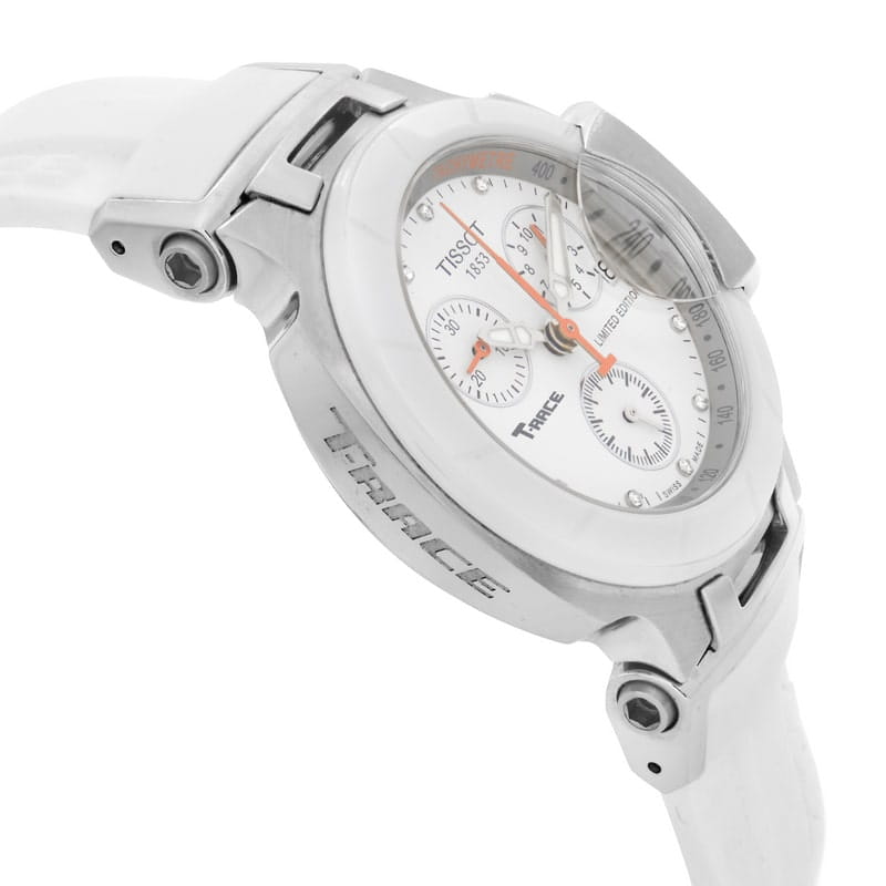 TISSOT T-Sport T-Race Quartz Chronograph - женские кварцевые наручные часы. Корпус этих часов среднего размера (37 мм) и выполнен из нержавеющей стали L316 металлического цвета. Модель имеет устойчивое к царапинам сапфировое стекло, силиконовый ремешок белого цвета, белый циферблат. Калибр механизма: ETA G15.211. Класс водозащиты: 100 м / 10 АТМ (разрешается плавание и ныряние без акваланга). Дополнительные функции и особенности: отображение числа, хронограф (секундомер), тахиметр.