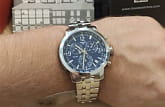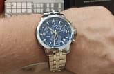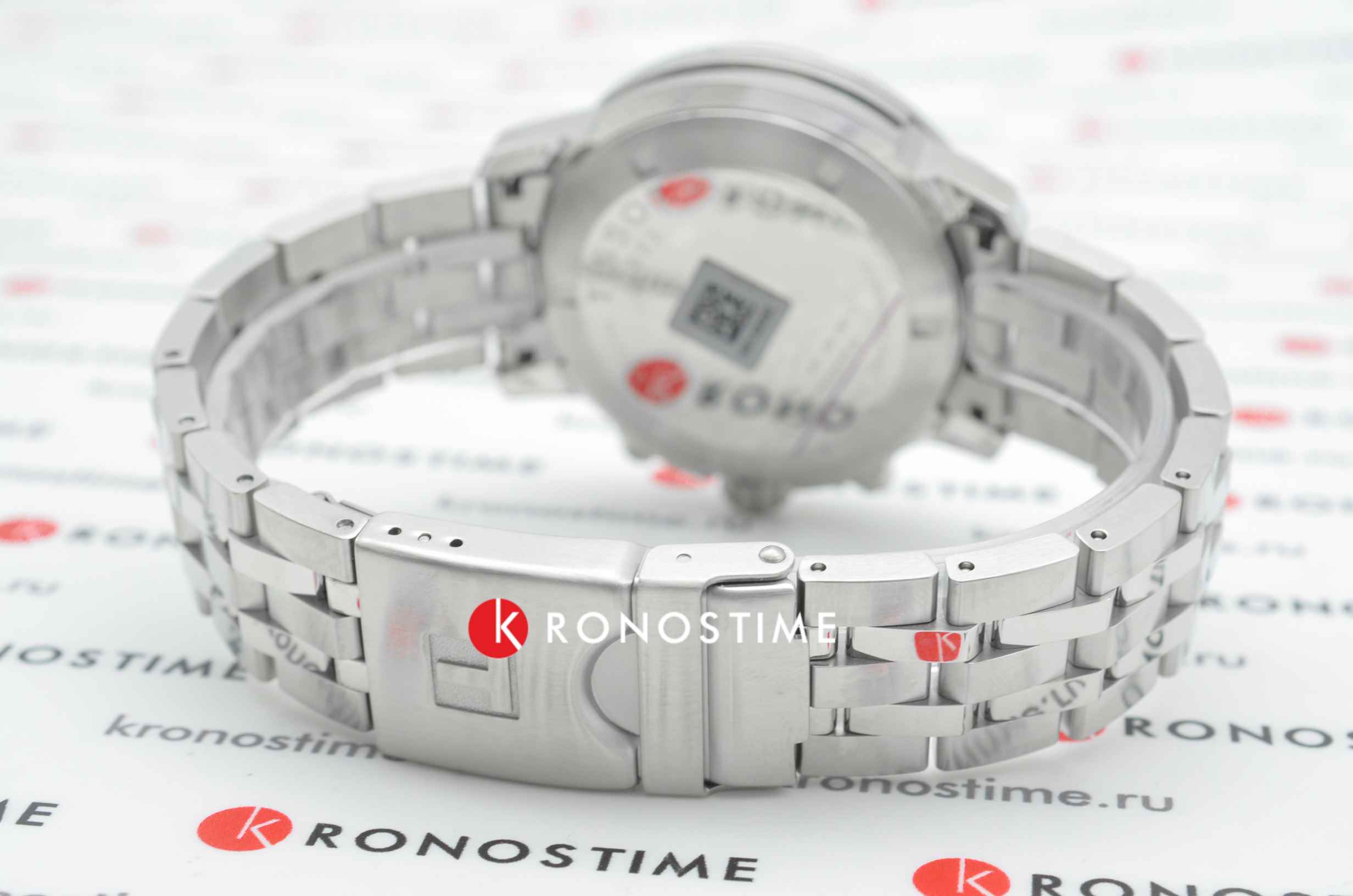 Швейцарские кварцевые часы комплектуются механизмом ETA G10.211 – популярный калибр с высокой точностью хода. Тёмно-синий циферблат дополнен стильными элементами: большие кнопки, 3 дополнительных счётчика, чёткие часовые индексы и конические стрелки с люминесцентной подсветкойЛюминесцентное покрытиеПозволяет считывать показания времени в темноте. Производители наносят на стрелки, часовые индексы, безель или поверхность циферблата светонакопительный состав, дающий холодное свечение.. Корпус из нержавеющей стали 316L. Завинчивающиеся заводная головка и задняя крышка корпуса. Водонепроницаемость 200 метров. Габариты: 42 x 43 x 12 мм.