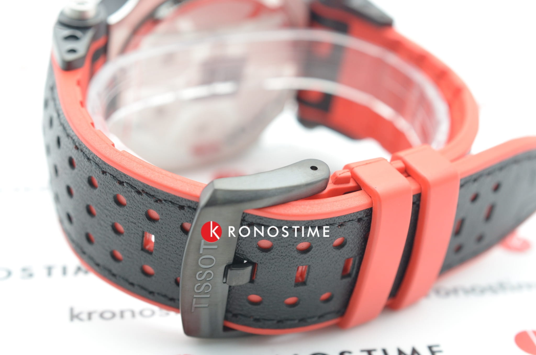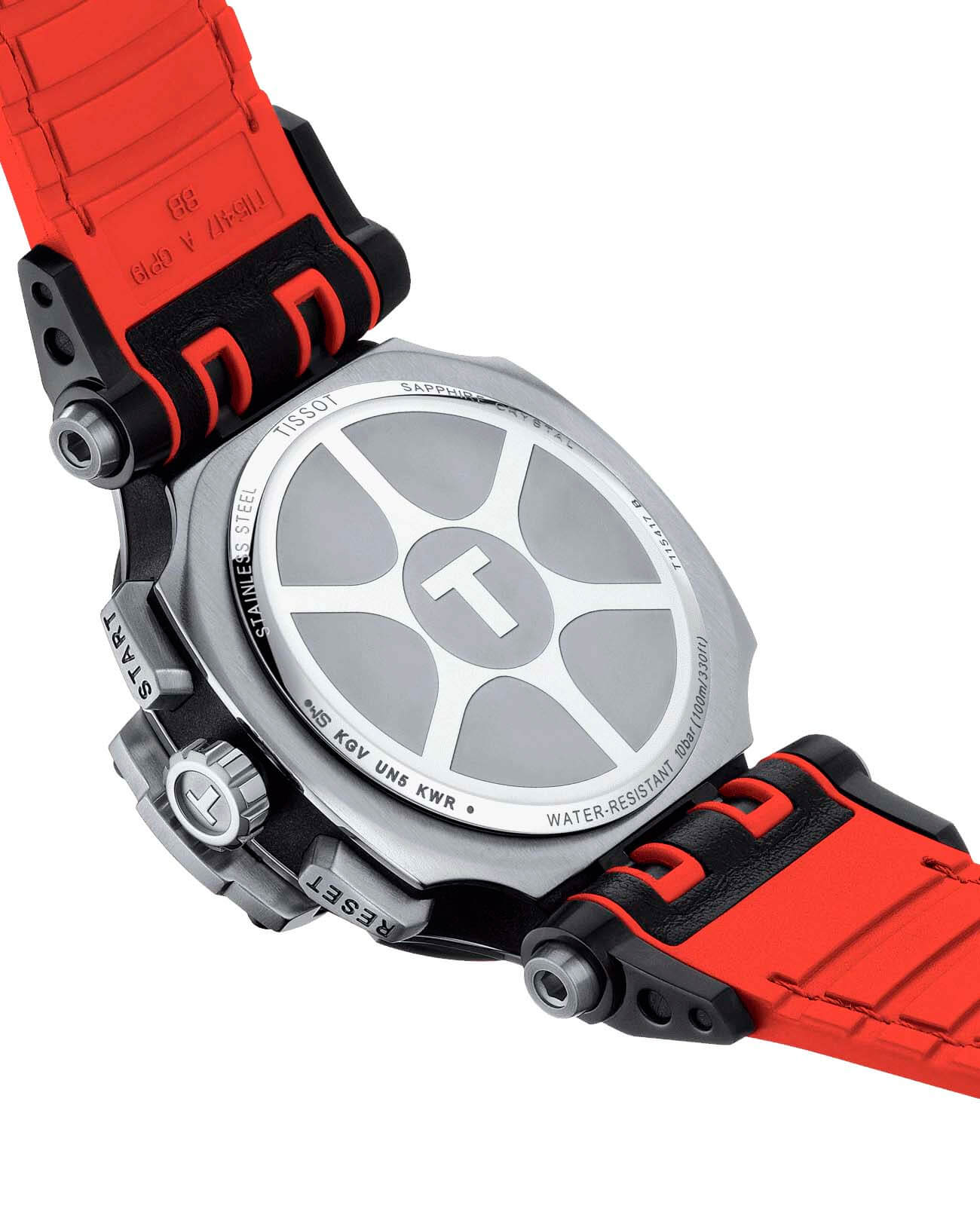 Эпатажные мужские часы из коллекции T-Race отражают динамику мотогоночных соревнований и чемпионский характер. Оригинальный аксессуар выполнен в спортивном стиле, характерно наличие крупных деталей, яркая расцветка, отсылка к деталям гоночных мотоциклов. Задняя крышка корпуса сделана в виде колеса, безельБезельВнешний ободок, закрепляющий стекло. В спортивных часах так называется поворотное кольцо с делениями на циферблате, выполняет роль таймера – замеряет отрезки времени на шкале. Неподвижный безель – элемент декора. Однонаправленно вращающийся безель на дайверских часах позволяет фиксировать моменты погружения и выныривания на поверхность. напоминает тормозную колодку. Наручные часы оснащены кварцевым механизмом швейцарского производства ETA G10.212. ХронографХронографФункция позволяет измерять отрезки времени с особой точностью: часы, минуты, секунды. Верным признаком хронографа является наличие на циферблате 3 дополнительных окошек-счётчиков. позволяет измерять показатели с особой точностью. Чёрное PVD-покрытиеPVDУльтратонкое покрытие наносится в технике вакуумного напыления, сочетает в себе нитрид титана особой прочности со слоем золота или оксида хрома. Несёт в себе декоративную или защитную функцию. корпуса. Сапфировое стекло. Водостойкость при давлении 10 бар. Секундомер, индикация даты. Габариты: 43 x 46,7 x 12,7 мм. Производство и сборка: Швейцария.