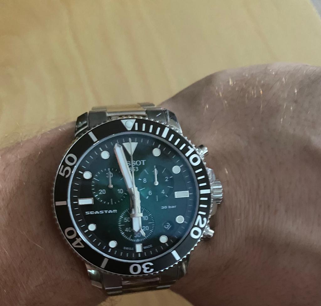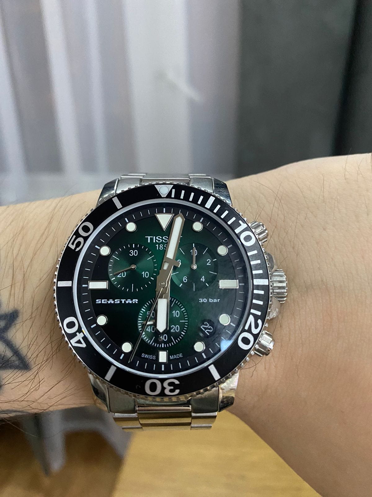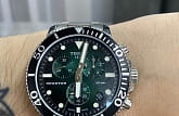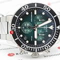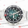На фоне серебристого браслета и темного безеляБезельВнешний ободок, закрепляющий стекло. В спортивных часах так называется поворотное кольцо с делениями на циферблате, выполняет роль таймера – замеряет отрезки времени на шкале. Неподвижный безель – элемент декора. Однонаправленно вращающийся безель на дайверских часах позволяет фиксировать моменты погружения и выныривания на поверхность. ярко выделяется зеленый циферблат, отлично видны серебристые стрелки и часовые метки с люминесцентным покрытиемЛюминесцентное покрытиеПозволяет считывать показания времени в темноте. Производители наносят на стрелки, часовые индексы, безель или поверхность циферблата светонакопительный состав, дающий холодное свечение.. Кварцевые часы оснащены батареей Renata 394. Завинчивающиеся кнопки, головка, прозрачная задняя крышка. Сапфировое стекло. Апертура даты. Габариты: 43 x 43 x 12,7 мм.