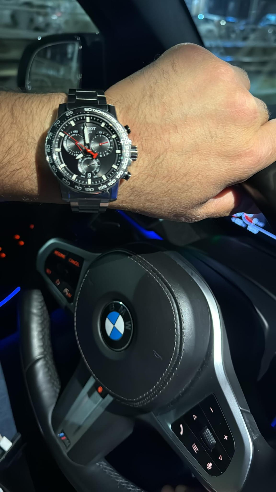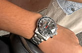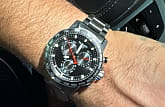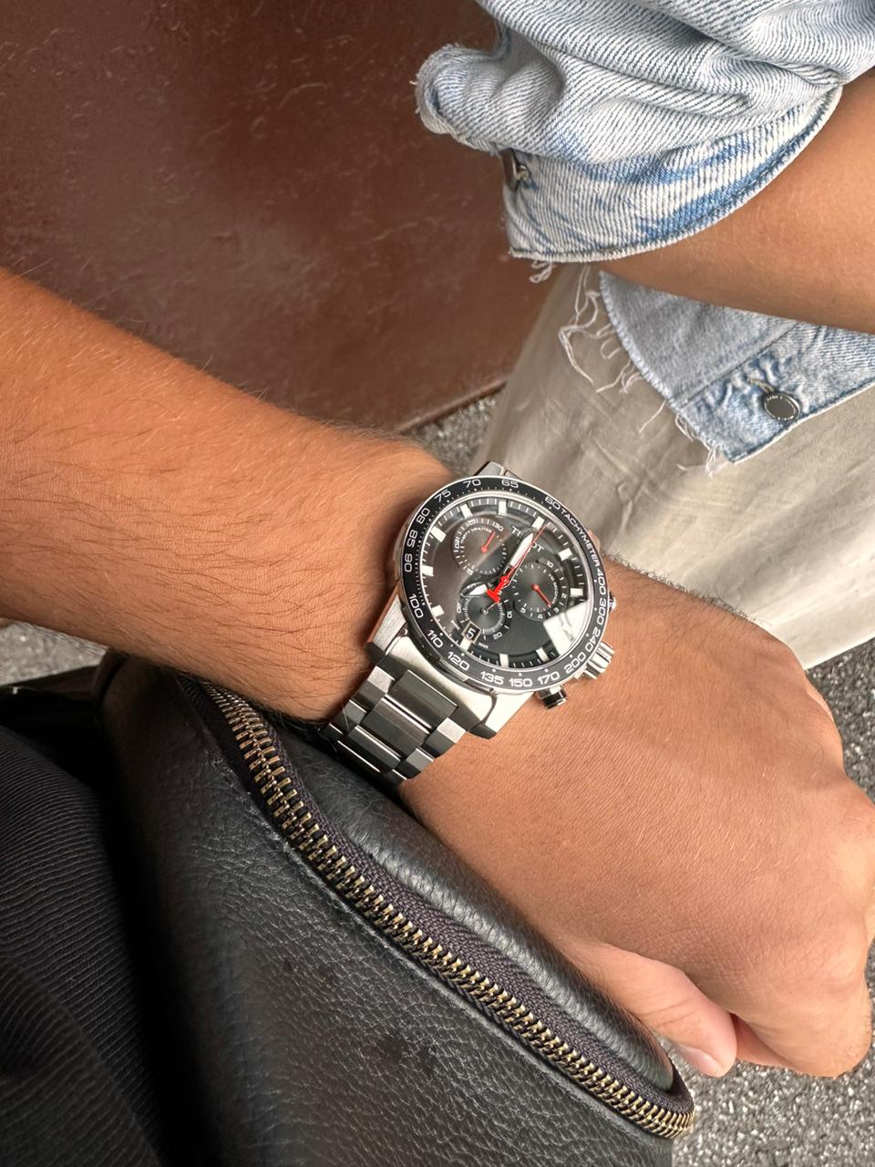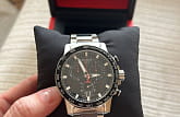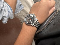 Современный хронографХронографФункция позволяет измерять отрезки времени с особой точностью: часы, минуты, секунды. Верным признаком хронографа является наличие на циферблате 3 дополнительных окошек-счётчиков. поможет подчеркнуть продуманный образ делового мужчины. Модель выполнена в спокойной серебристо-чёрной расцветке, исключение – ярко-красные стрелки, измеряющие секунды. Наручные часы функционируют благодаря швейцарскому кварцевому механизму ETA G10.212. Калибр отличается максимальной точностью хода. Стекло из сапфира. Водостойкость 100 метров. Надёжный корпус из антикоррозионной стали 316L. Люминесцентная подсветкаЛюминесцентное покрытиеПозволяет считывать показания времени в темноте. Производители наносят на стрелки, часовые индексы, безель или поверхность циферблата светонакопительный состав, дающий холодное свечение. стрелок и индексов. Секундомер, отображение даты. Диаметр корпуса: 45,5 мм.