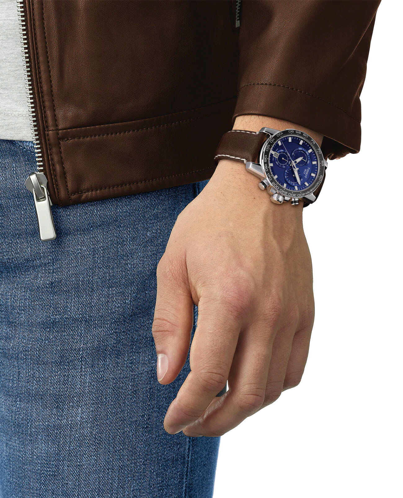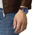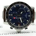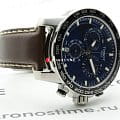 Массивный стальной корпус привлекает брутальными, характерными деталями. Это идеальный вариант для мужчины, желающего всегда быть в центре внимания. Ярко-синий циферблат в окружении чёрного безеляБезельВнешний ободок, закрепляющий стекло. В спортивных часах так называется поворотное кольцо с делениями на циферблате, выполняет роль таймера – замеряет отрезки времени на шкале. Неподвижный безель – элемент декора. Однонаправленно вращающийся безель на дайверских часах позволяет фиксировать моменты погружения и выныривания на поверхность. со шкалой тахиметраТахиметрРазмеченная шкала, располагается на ободке или безеле часов. Тахиметр позволяет рассчитать скорость на определённом участке пути, расстояние измеряется в километрах или милях. – беспроигрышное сочетание. Ремешок из натуральной кожи с крупной белой прострочкой является элементом из спортивного мира. Динамичный хронографХронографФункция позволяет измерять отрезки времени с особой точностью: часы, минуты, секунды. Верным признаком хронографа является наличие на циферблате 3 дополнительных окошек-счётчиков. измеряет время с абсолютной точностью хода благодаря швейцарскому кварцевому механизму ETA G10.212. Сапфировое стекло устойчиво к царапинам. Стрелки и индексы дополнены люминесцентным покрытиемЛюминесцентное покрытиеПозволяет считывать показания времени в темноте. Производители наносят на стрелки, часовые индексы, безель или поверхность циферблата светонакопительный состав, дающий холодное свечение.. Среди функций: секундомер, отображение даты. Высокая водонепроницаемость – до 100 метров. Диаметр корпуса: 45,5 мм.
